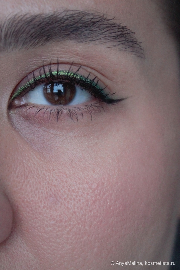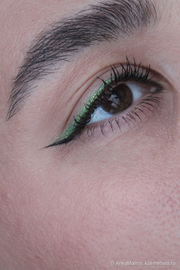 Жаль, конечно, что мультихромность Arive Makeup Glimmerverse Fairy Wand Multichrome 03 Frog Princess на снимках плохо читается, но она есть, так и знайте. Стойкость у подводки до победного, а при нанесении нет ощущения мелка по доске — всё мягко и нежно.