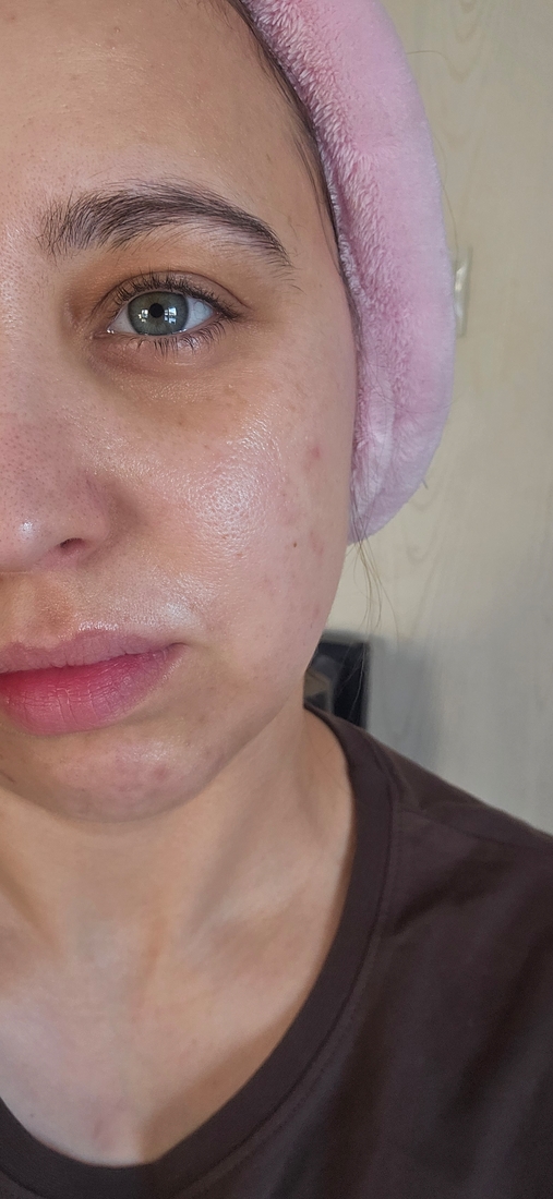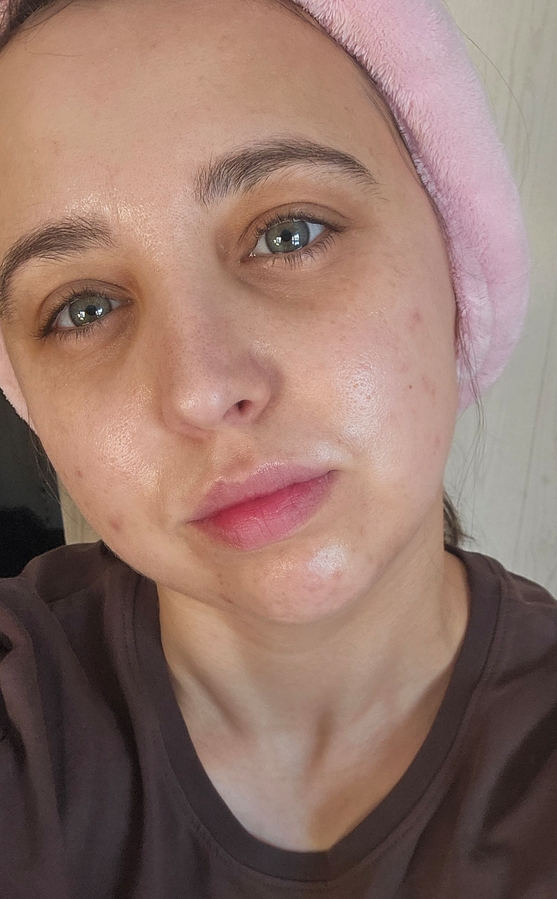 После нанесения кожа выглядит увлажнённой, напитанной и очень красиво сияющей. Не глянцево, не масляно, а именно свежо и ухоженно, это тот самый эффект, когда кожа довольна.