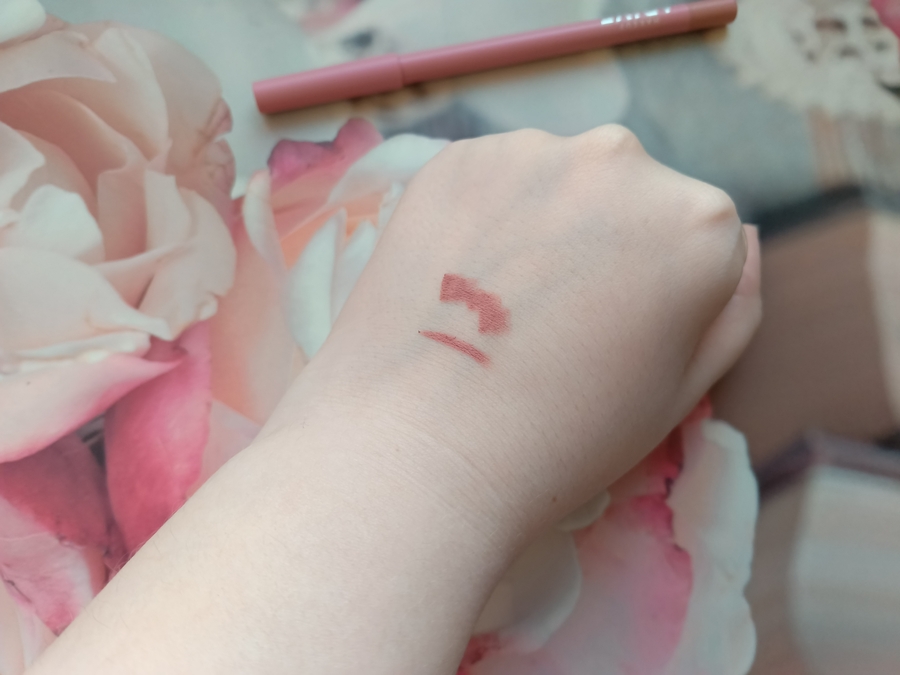 Хоть карандаш и мягкий, финиш у него матовый. И он не ложится на слизистую и на сухие участки губ. На свотчах ниже я сдеалала контур и заштриховала губы полностью. Оттенок получился теплее в сочетании с моей внешностью.