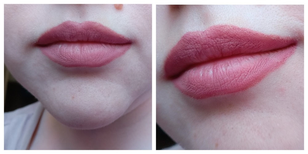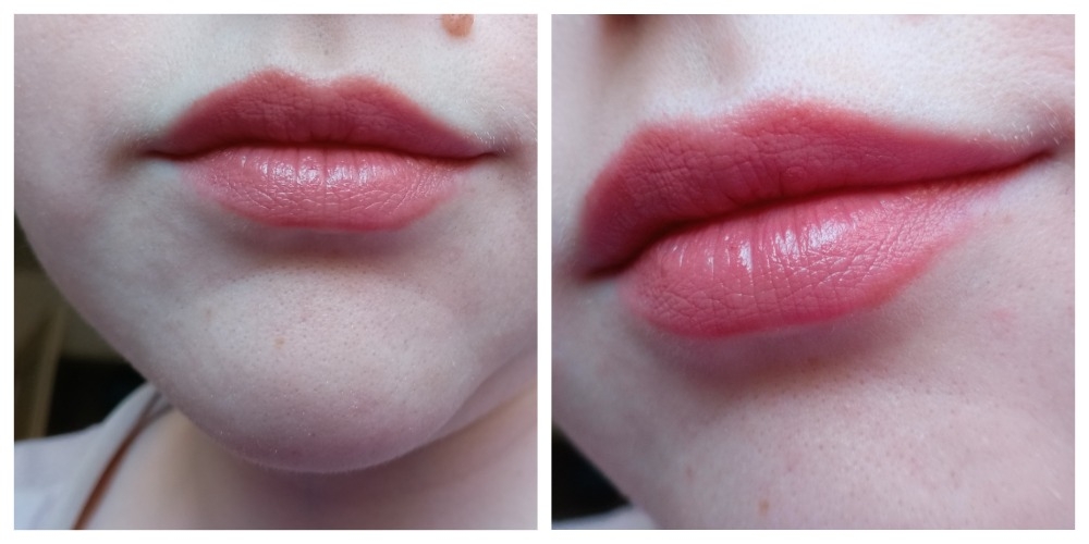 На свотче ниже слева провела линию острием, справа растушевала боковой поверхностью. Оттенок темнее и как будто чуть менее ровно ложится на кожу. Этот розовый холодный нюд подходит мне гораздо больше.