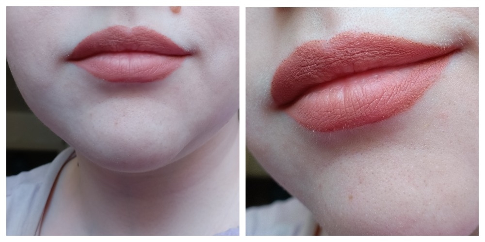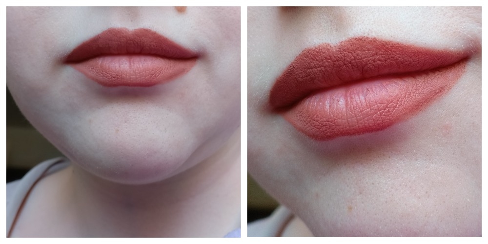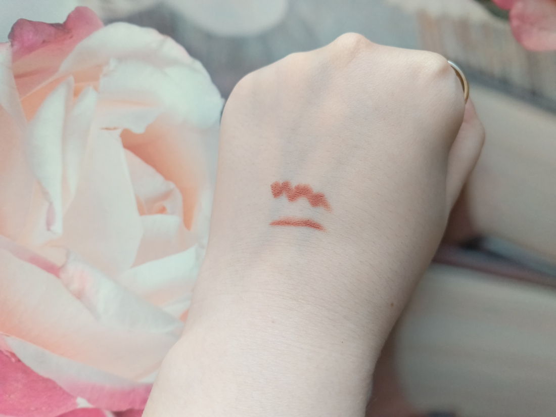 Оттенок яркий, коричневатый с краснинкой. Я такое люблю. И если бы карандаш лучше лежал на стыке губ, я бы с удовольствием носила его в таком виде. Но увы, видно, как неровно он ложится на шелушения.
