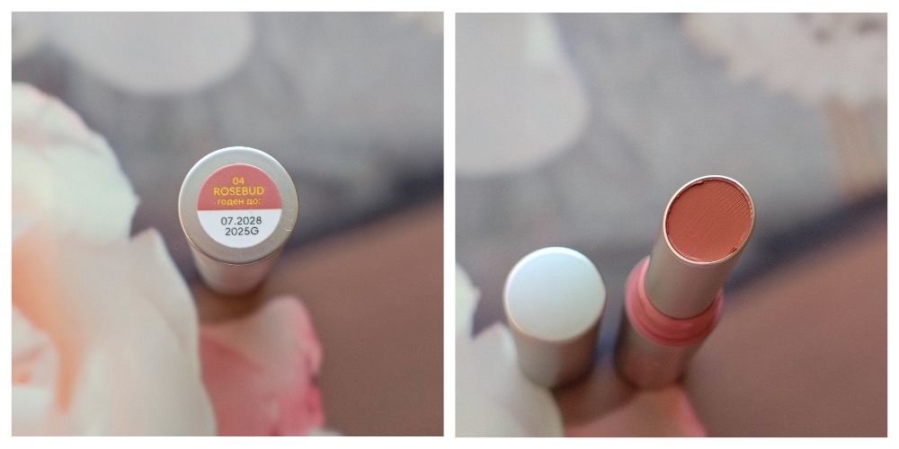 Это сатиновая помада в нейтральном нюдовом оттенке. Стик средней толщины, налит в патрон до верха. Но видно, что срез не самый ровный, хотя помада безусловно новая. Опять таки, приехала в плотной пластиковой пленке.