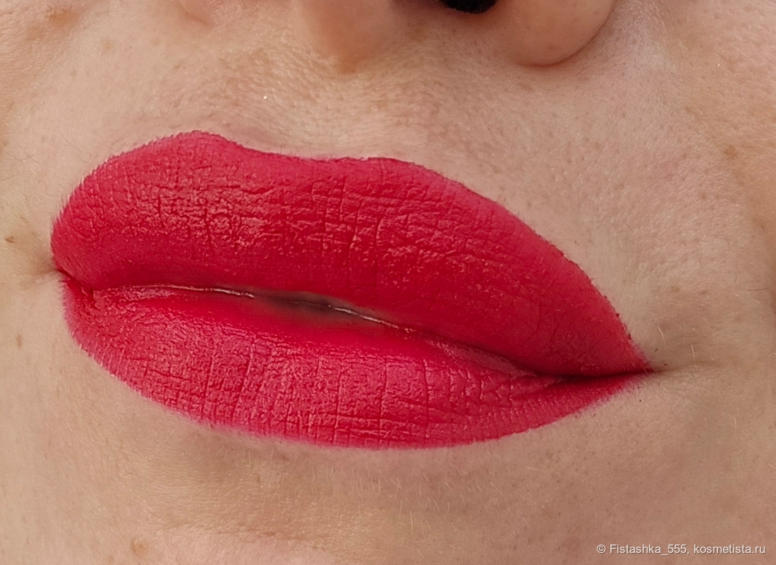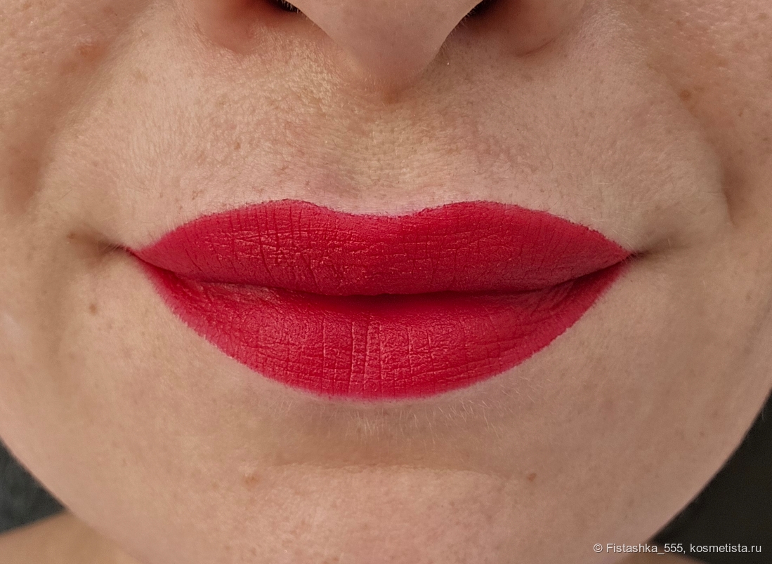 На губах тинт смотрится просто потрясающе – глубокий матовый финиш, который визуально придает объем. Пигментация отличная – достаточно одного слоя для полного перекрытия собственного пигмента губ.