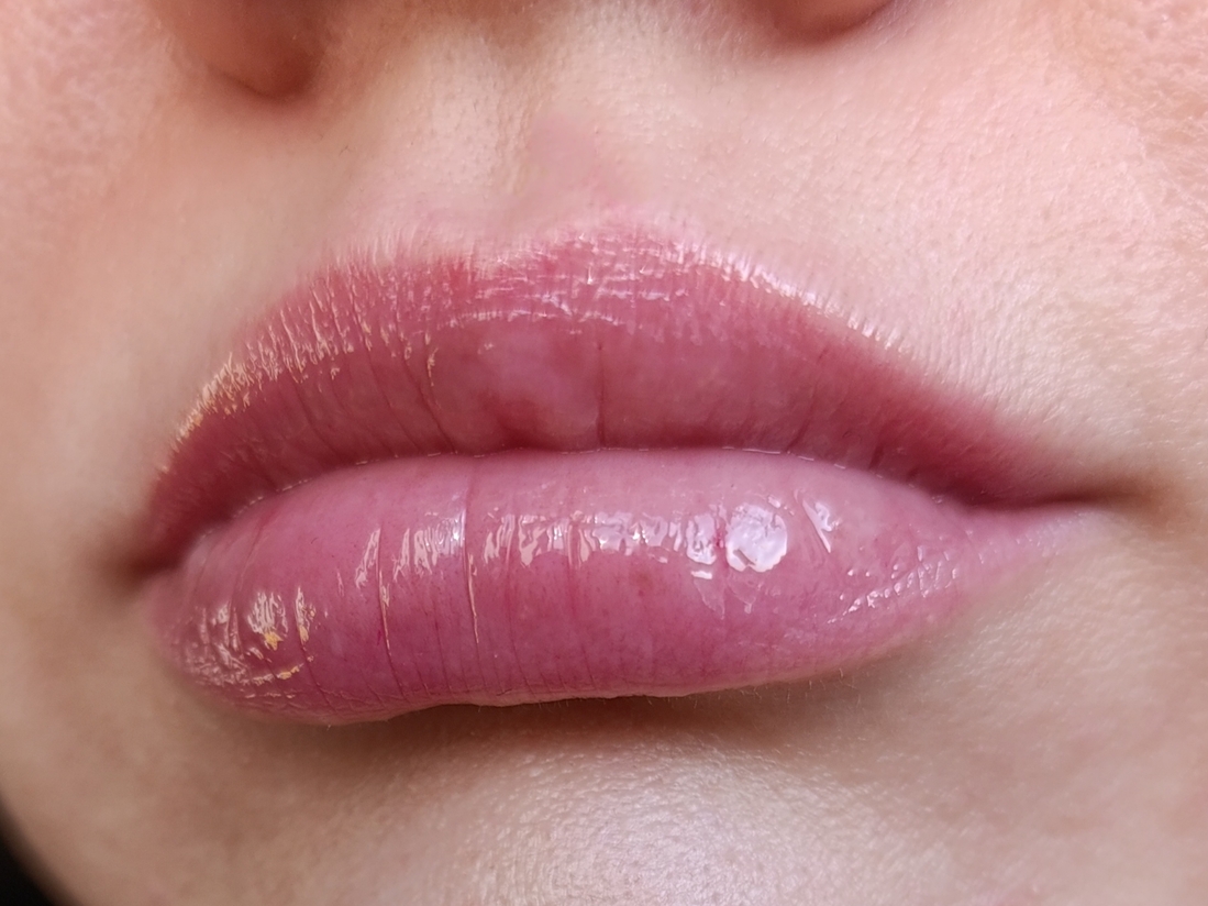 На губы в каком состоянии возможно нанести: в любом, ухаживающие свойства, заявленные производителем, есть. Давайте посмотрим на масло через 10 минут после нанесения на очень сухие губы:
