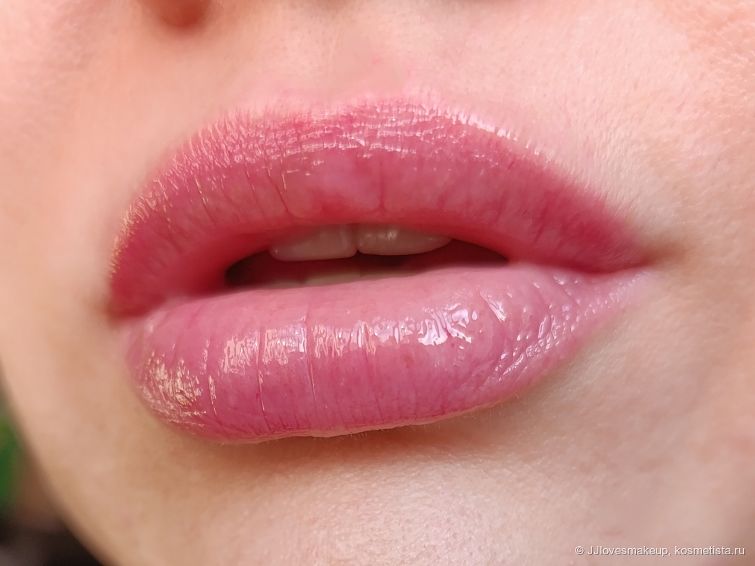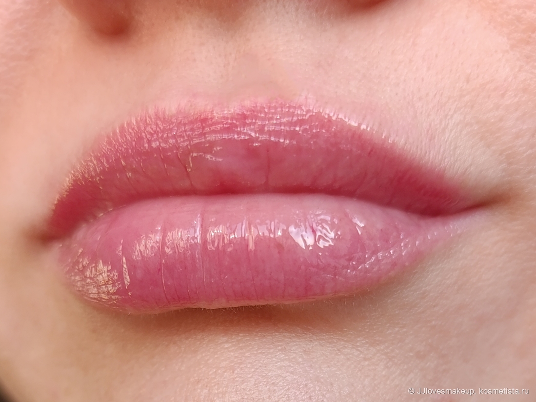 Матовое/сатиновое/глянцевое: глянцевое, глянец водянистый, но не густой, даёт эффект влажных губ. Сначала он средней яркости, в конце слабый, стойкость к глянца как и у масла, часа три с постепенным уменьшением.