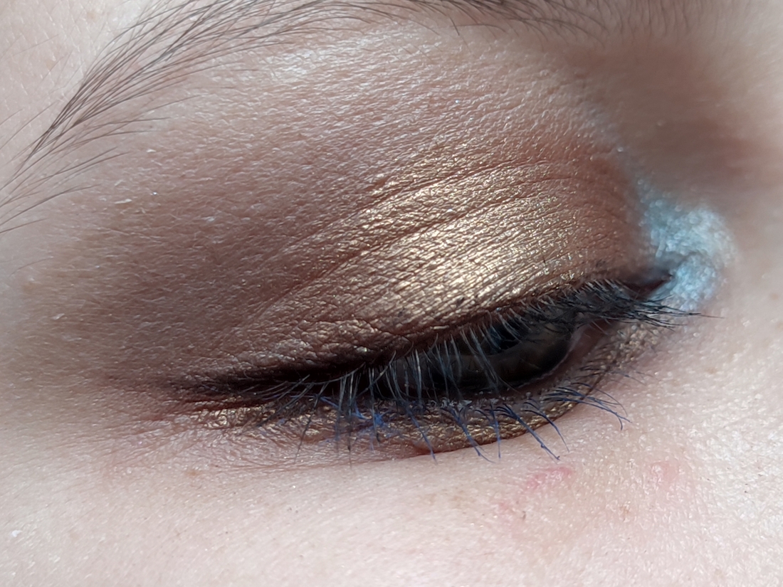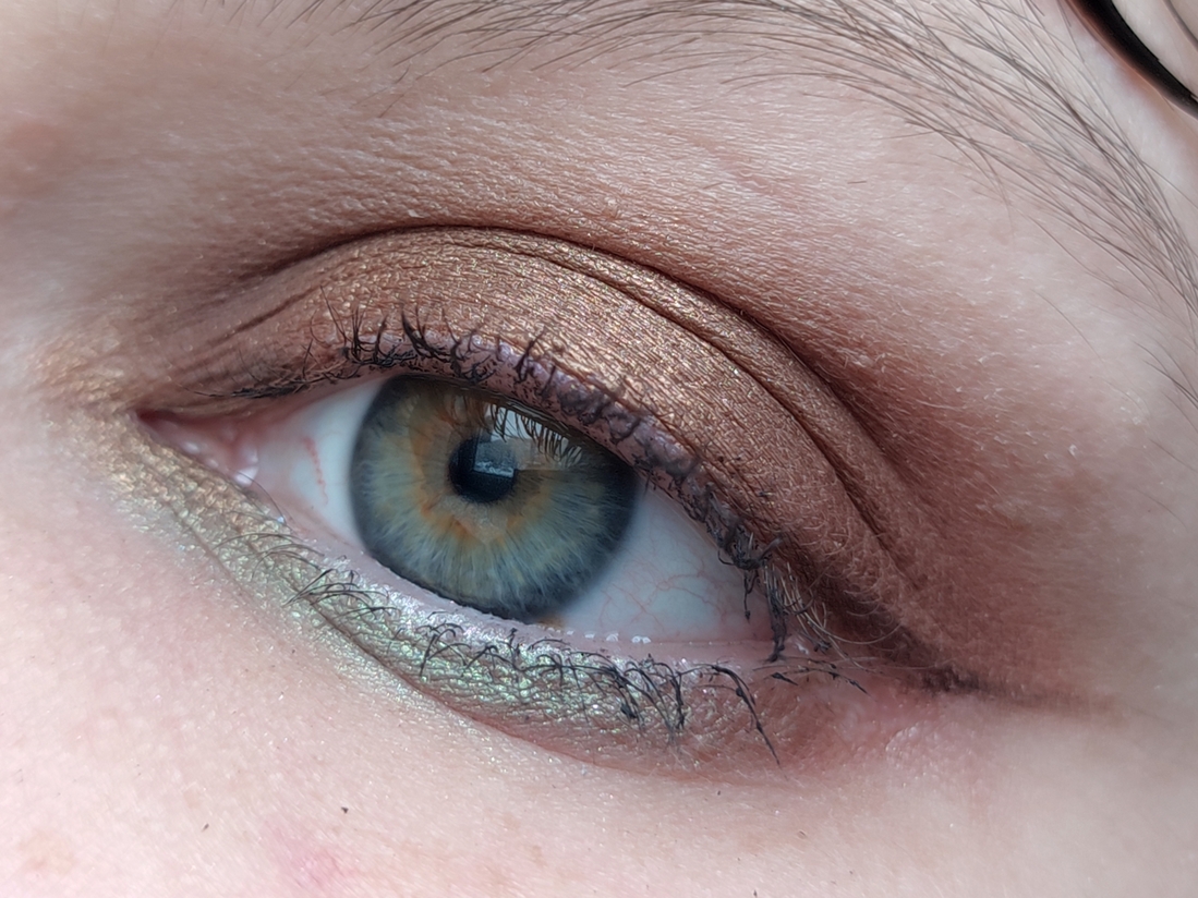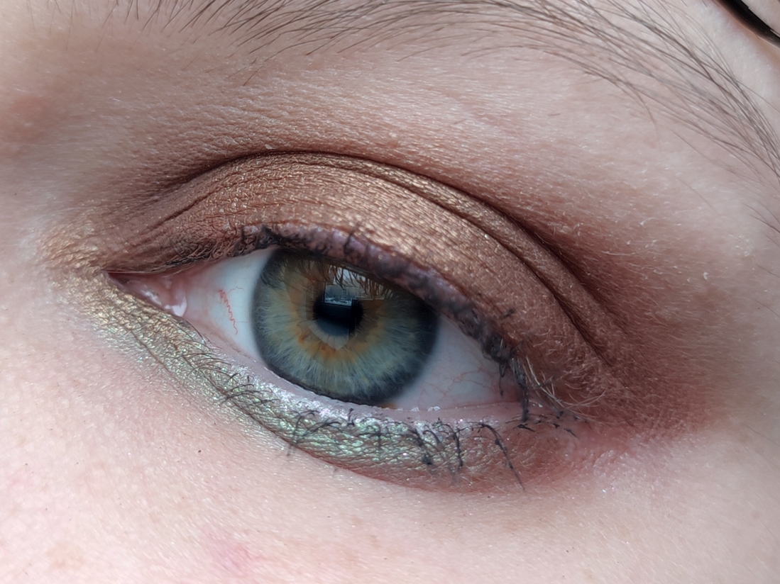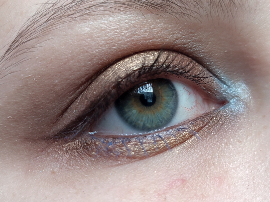 Теплый бронзовый металлик. Тоже достаточно повседневный. Влажный, как и другие металлики. Очень пигментированный. Наносится легко и кистью, и пальцем, хорошо тушуется. Не осыпается. Хорошо держится на веке до конца дня.
