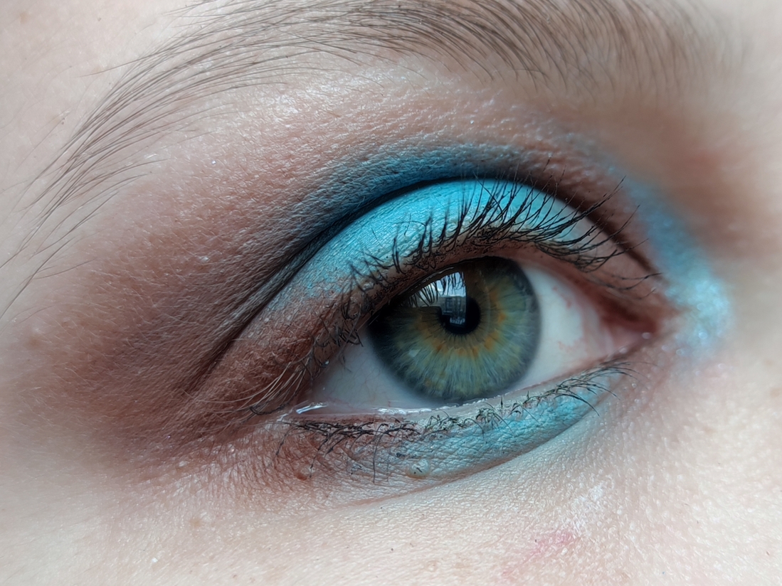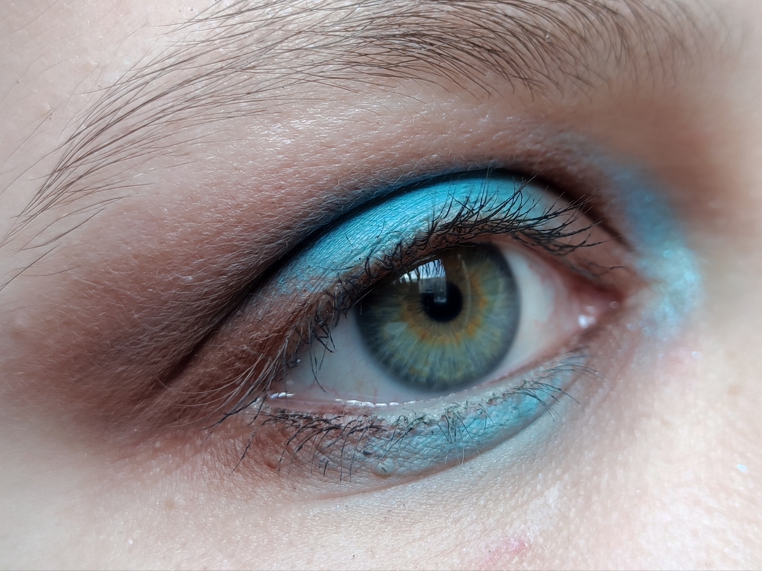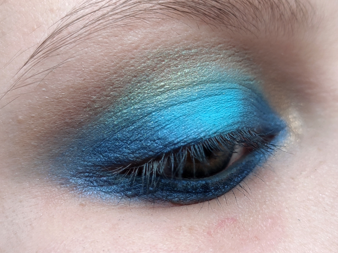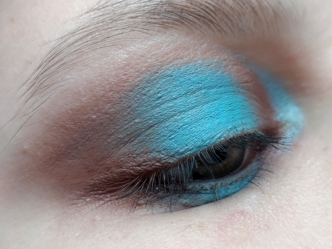 Вырвиглазный голубой. Цвет чистого жаркого неба, умноженный на триста. Самый яркий оттенок палетки. И удивительно беспроблемный для таких сложных цветов. Финиш матовый. Пигмент переносится с полукасания, легко растушевывается, не скатывается. Пылит не сильно. На моих веках окисляется к вечеру, если наносить без базы или не припудрить предварительно веко.