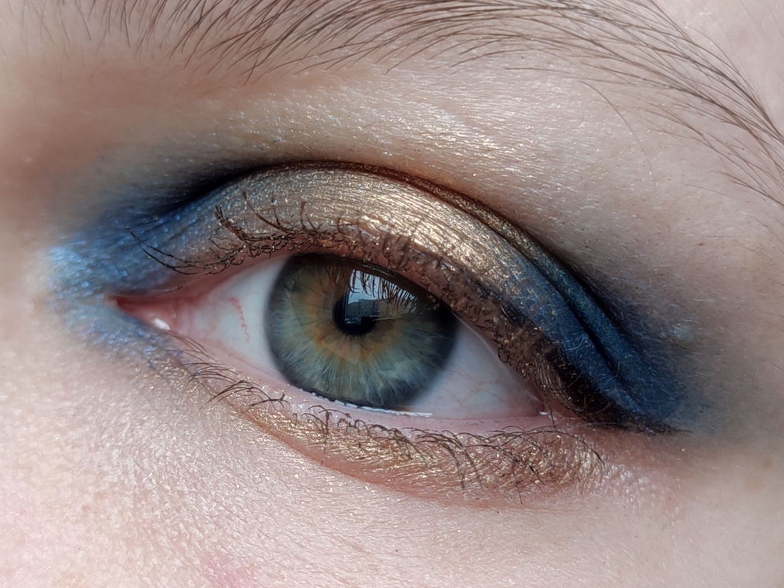 На базе Artdeco. На ресницах золотые тени из палетки.
