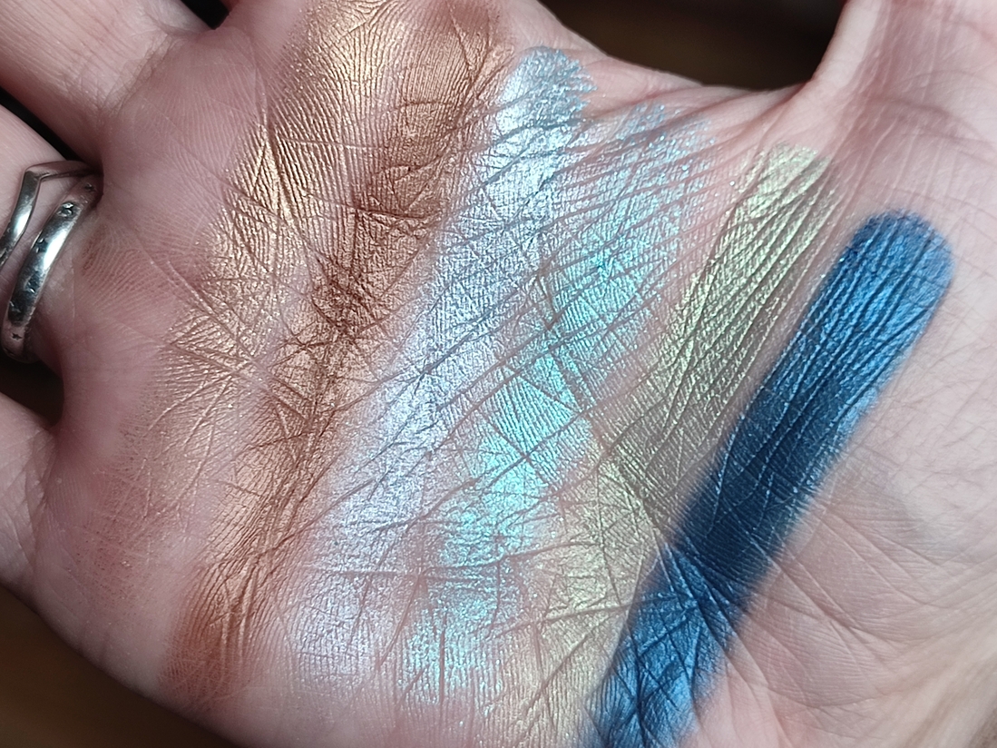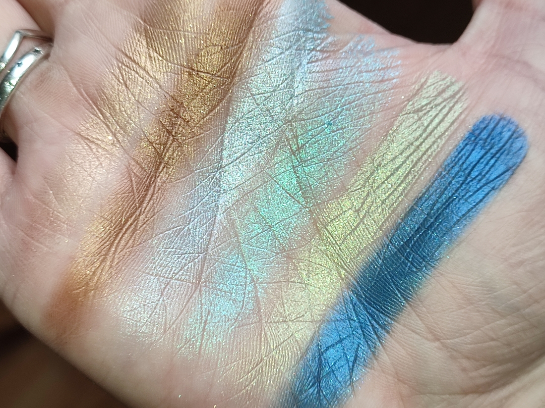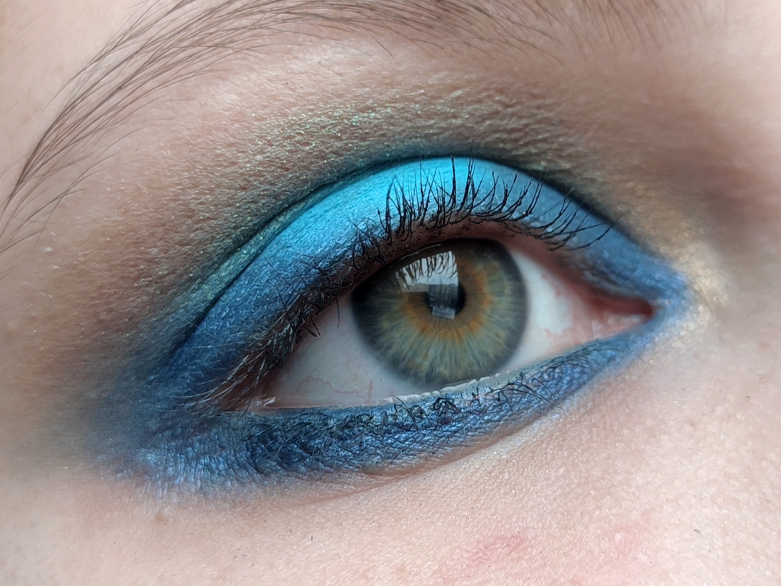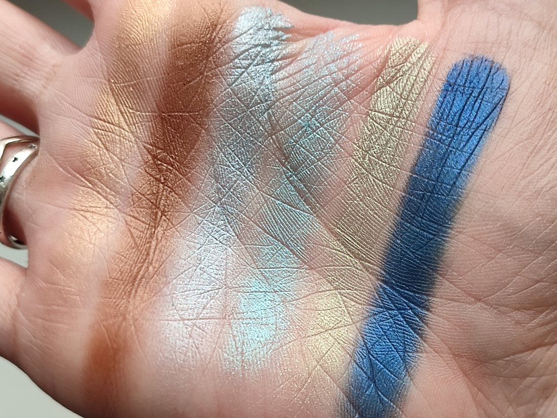Голубой металлик. В описании палетки он числится металликом, но я бы назвала его топпером. Оттенок яркий, горящий, искрящийся. В искусственном освещении переливается тысячей искр перетертого битого стекла. По текстуре оттенок суше остальных металликов, но все равно остаётся влажным. Наносится полупрозрачно, т.к. оттенок не имеет базы, но ложится достаточно плотно. Легко наносится кистью, пальцем ложится плотнее. Не скатывается, не пылит. Может осыпаться при нанесении. Один из любимых в палетке.