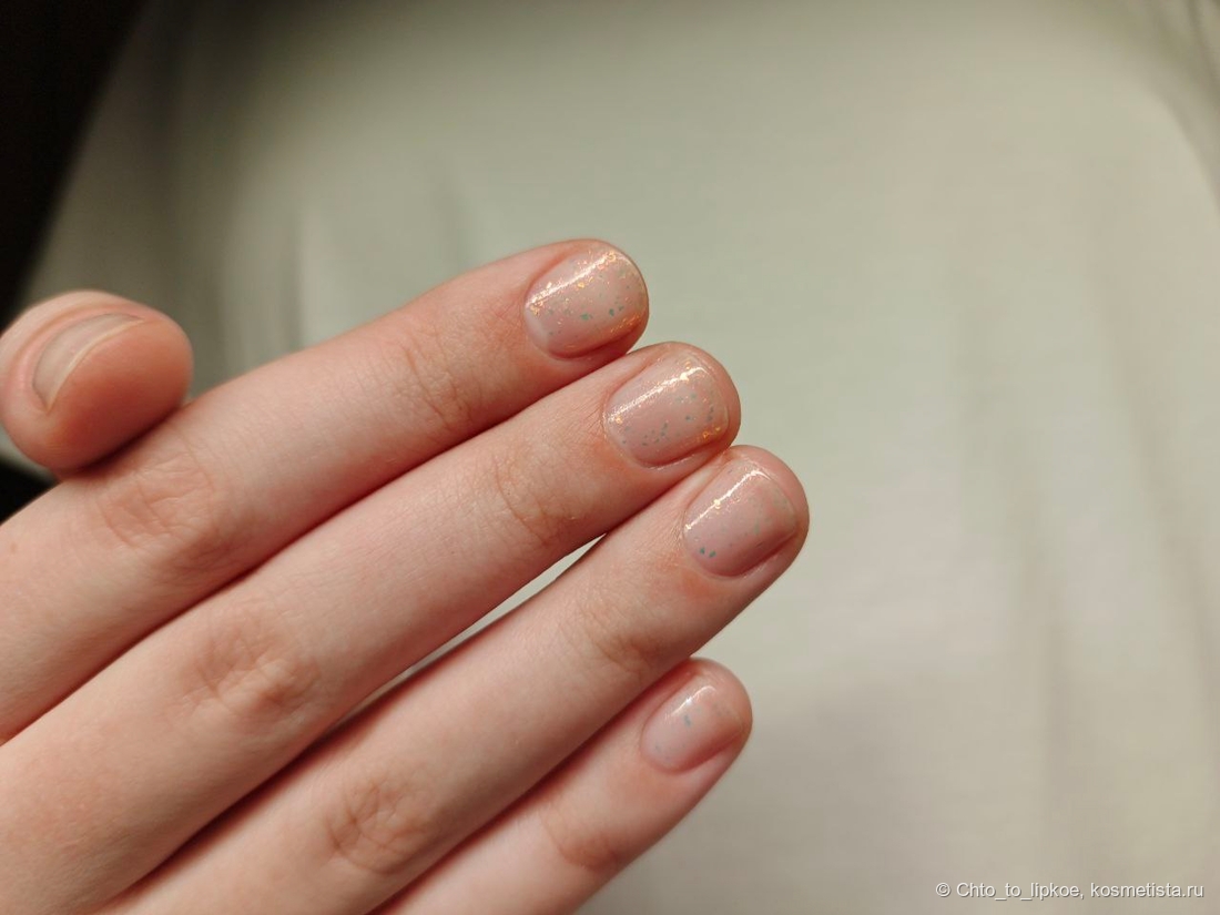 В нанесении прост, как лом в разрезе. Не полосит, быстро сохнет, поскольку слюды положили не жалеючи, то особых проблем с равномерным распределением ее по ногтю нет. Покрытие в два слоя считаю оптимальным, потому что в один слой лак практически незаметен, а в два — уже теряет свою легкость и воздушность.