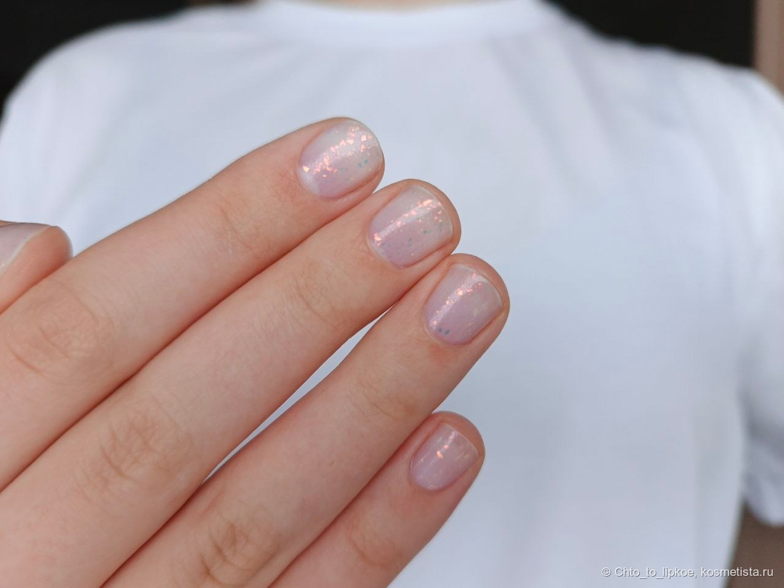 Лак представляет собой замес оранжево-фиолетового шиммера и оранжево-голубой слюды. Все это находится в белесой, практически прозрачной базе, цвет которой считывается только при дневном свете и почему-то на нем приобретает лиловый оттенок. Вообще лак можно уличить в небольшой хамелеонистосте, так как при дневном освещении он белесый с оранжевой слюдой, при искусственном — прозрачный с голубой. На промо-фото лак выглядит вовсе не так, как в жизни. Это, наверное, первый раз, когда я встречаю продукт, который в жизни выглядит интереснее, чем в карточке товара.