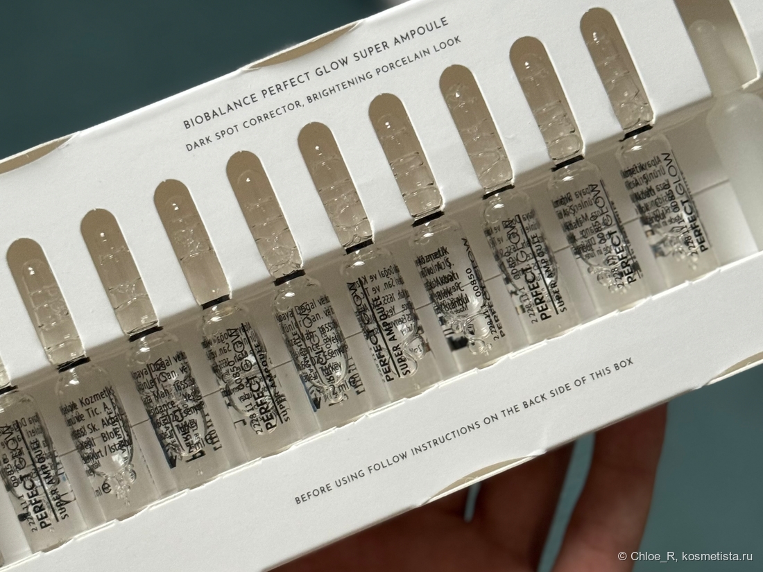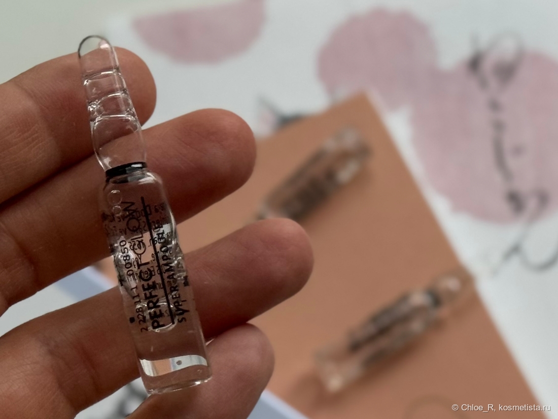 Сама сыворотка жидкая и прозрачная, не липкая, без запаха. Количества 1/3 ампулы идеально хватает для всего лица.