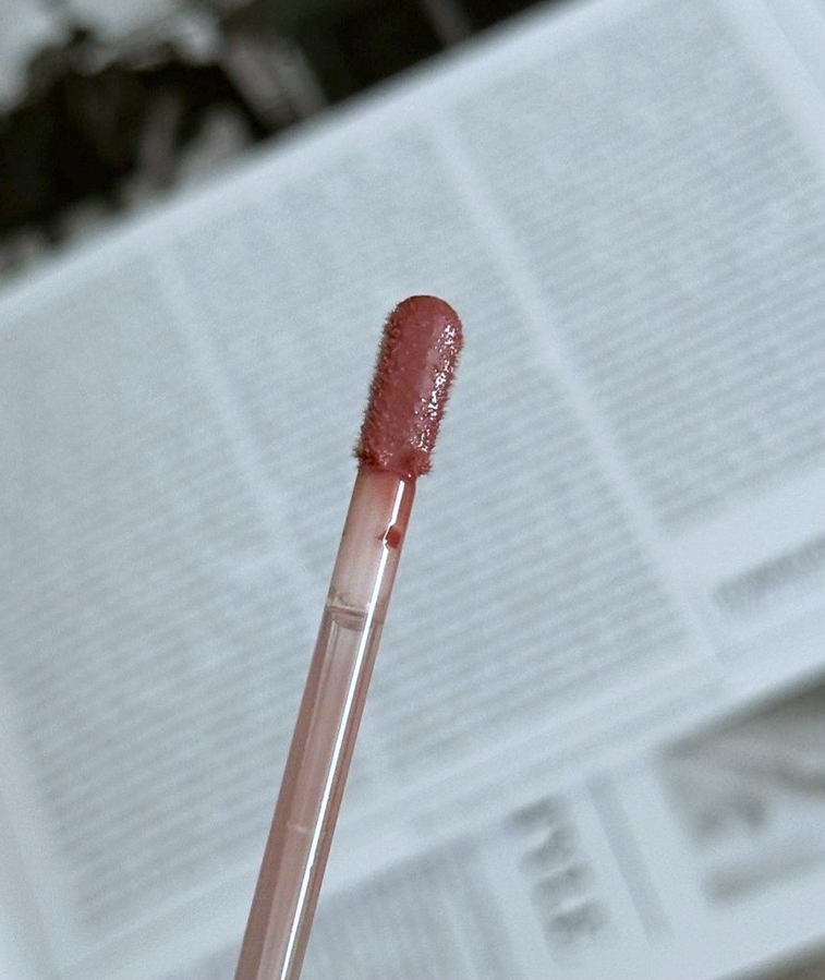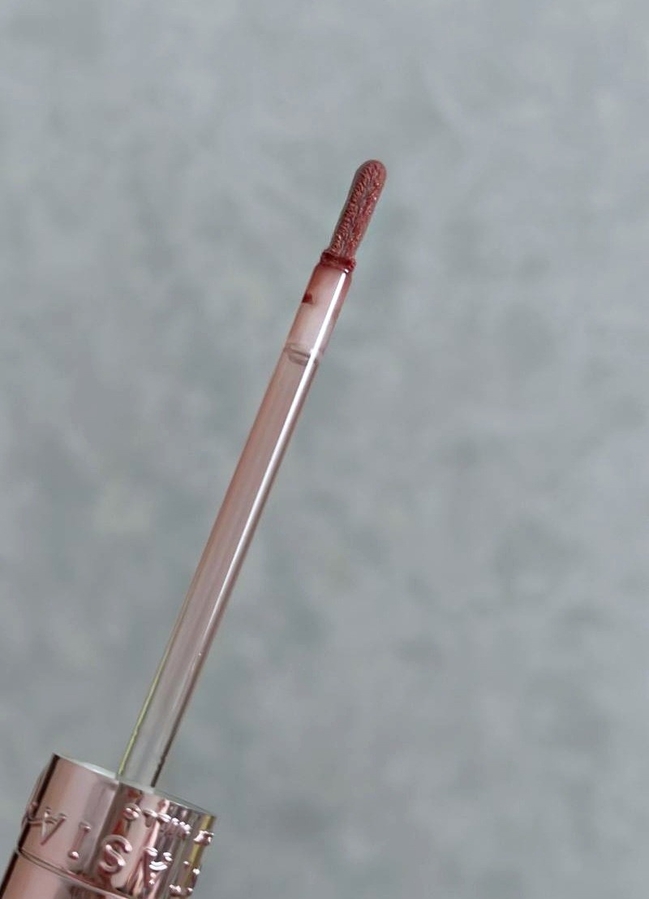 Оттенок достаточно плотный для блеска, с хорошей пигментацией. При нанесении на один тоненький слой даёт красивый полупрозрачный эффект, а при более плотном слое и с карандашом по контуру даёт прямо плотное покрытие а-ля бальзамная помада, перекрывает оттенок губ.