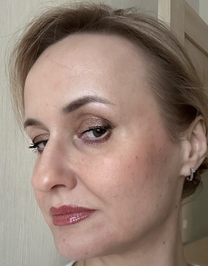 Вот в полном макияже я с контуром и блеском. Здесь блеск нанесён на 2 слоя. И когда я фотографировалась, прошло уже где-то полчаса после нанесения.