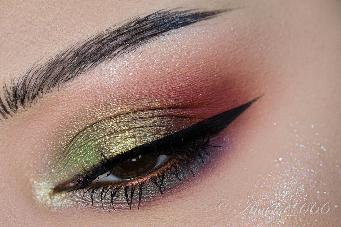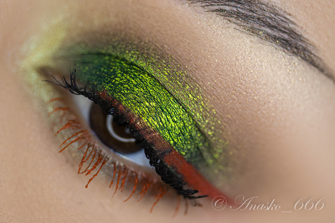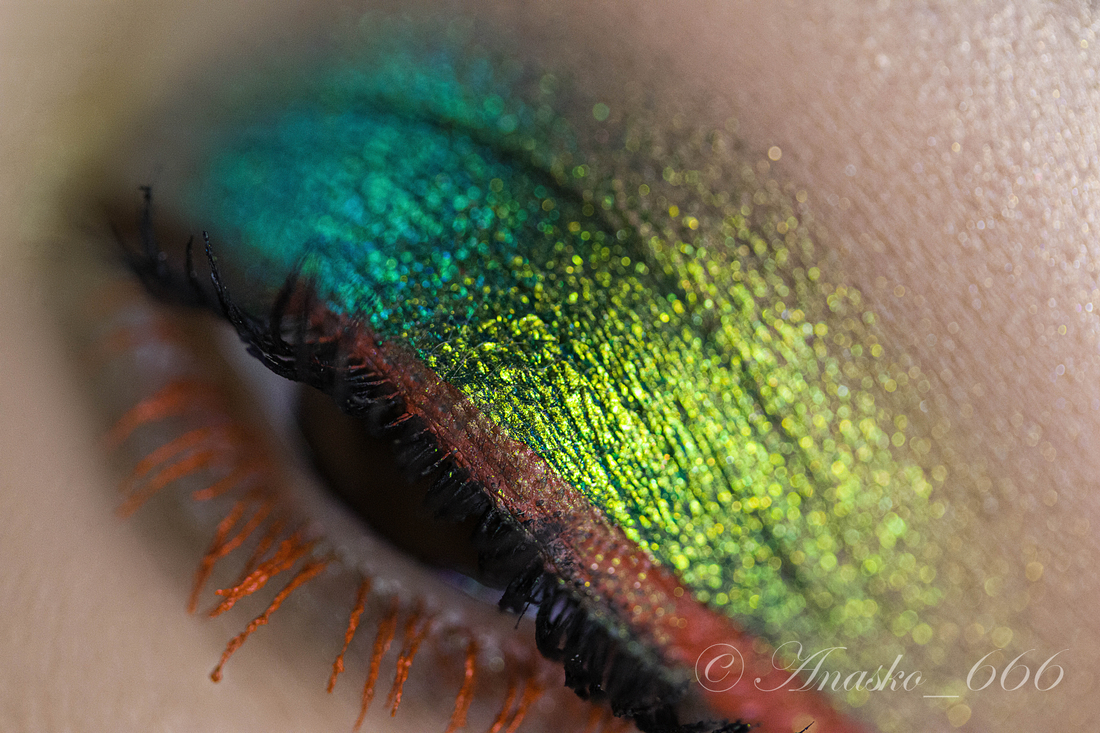 Изумрудный хроматик, шифт из салаового в сине-зеленый через изумрудный. В отличии от большинства темных хроматиков, база у оттенка не слишком темная, скорее полупрозрачная серовато-коричневая, что упрощает работу с хроматиком.