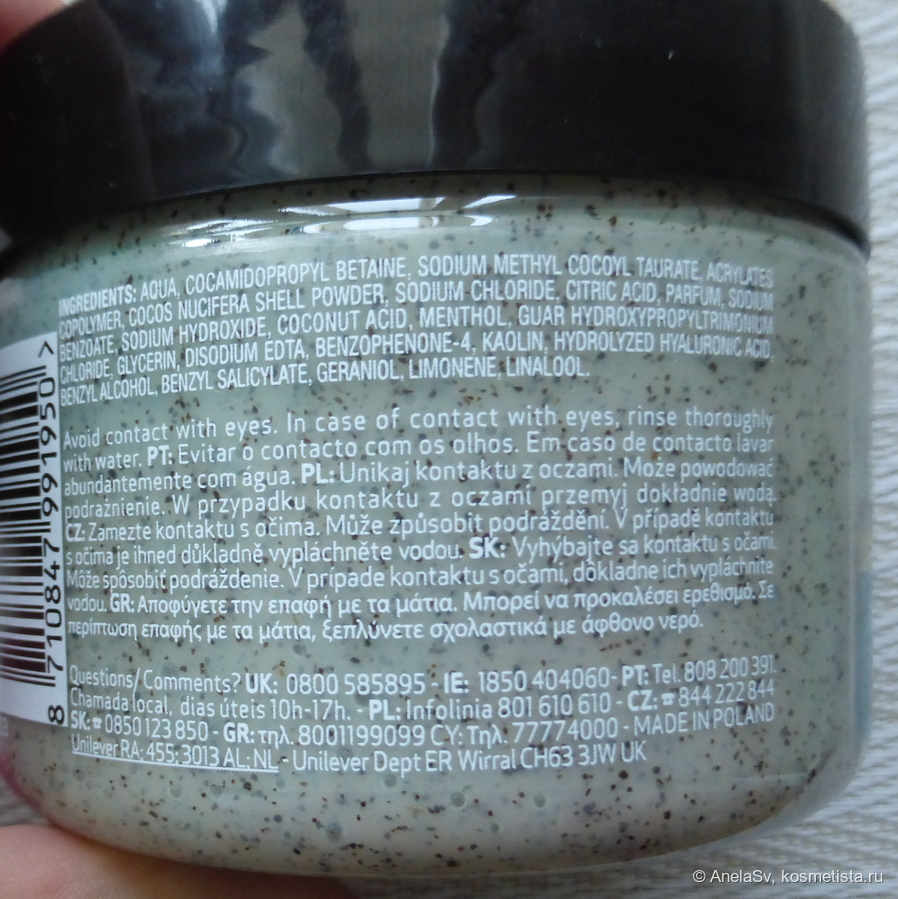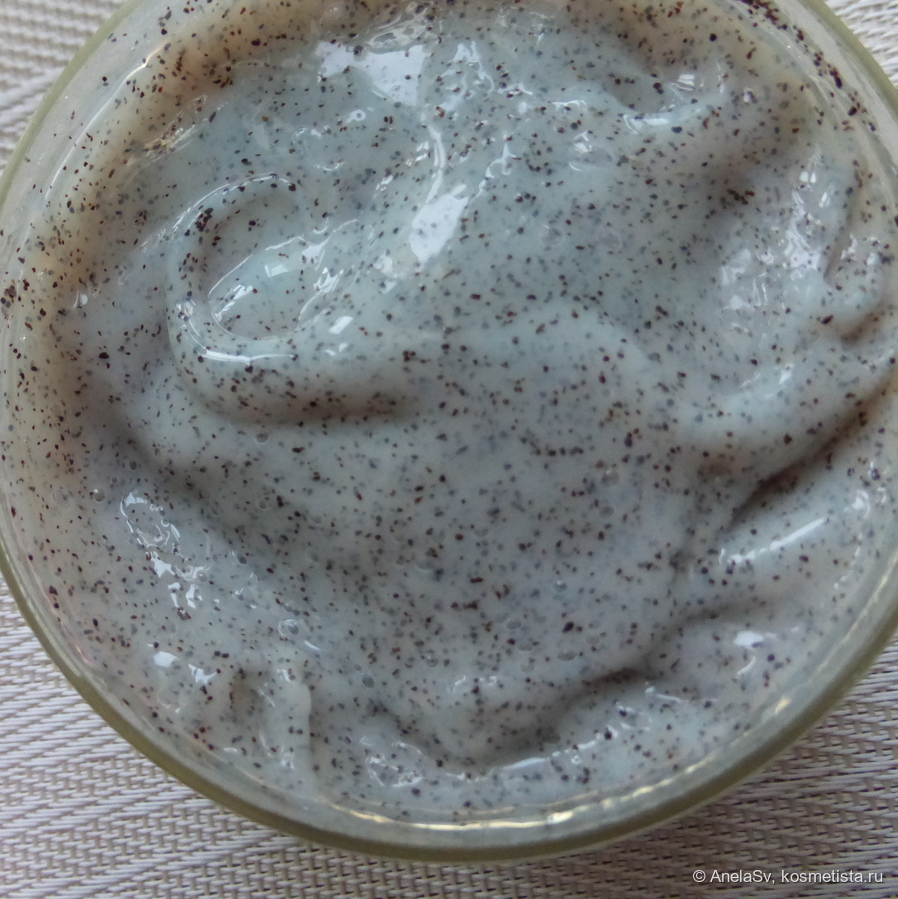 Средство выпускается в объёме 300 мл, мне этого хватило примерно на полгода при еженедельном применении. Текстура у пилинга довольно необычная: густое голубоватое желе с мелкими скрабирующими частицами. По составу похоже, что это смесь пластиковых гранул и кокосовой крошки. В формуле есть также глина и ментол — последний приятно охлаждает кожу при массировании.