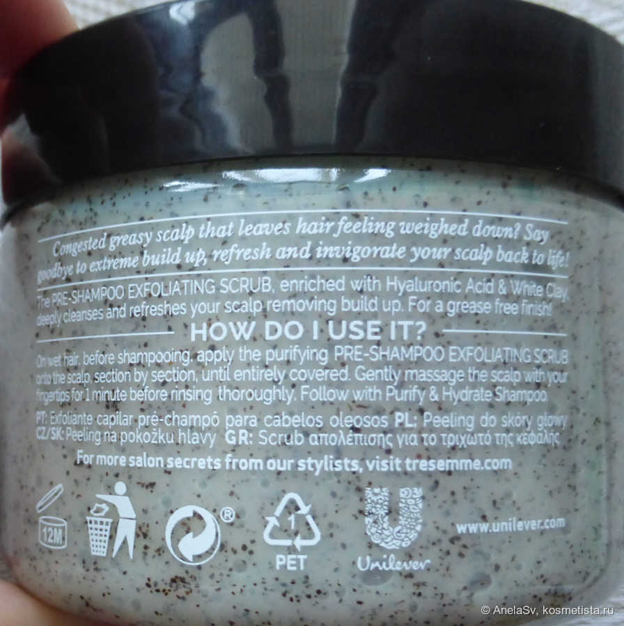 Пилинги для кожи головы уже давно стали частью моего ухода. Я перепробовала массу вариантов — от кислотных и солевых до энзимных пудр. Недавним моим открытием стал TRESemme Purify & Hydrate, баночка которого уже полностью использована.
