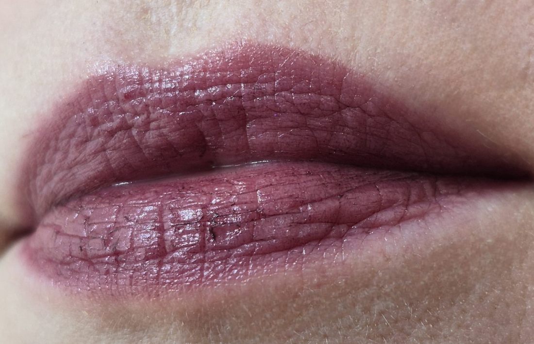 Нанесение пальцем из стика даёт холодный виноградный оттенок. На нижней губе есть шелушения и там залипания видны больше ( Интересно, когда я добьюсь стабильного хорошего состояния кожи губ?) При этом помада не мигрирует в «соседние регионы».