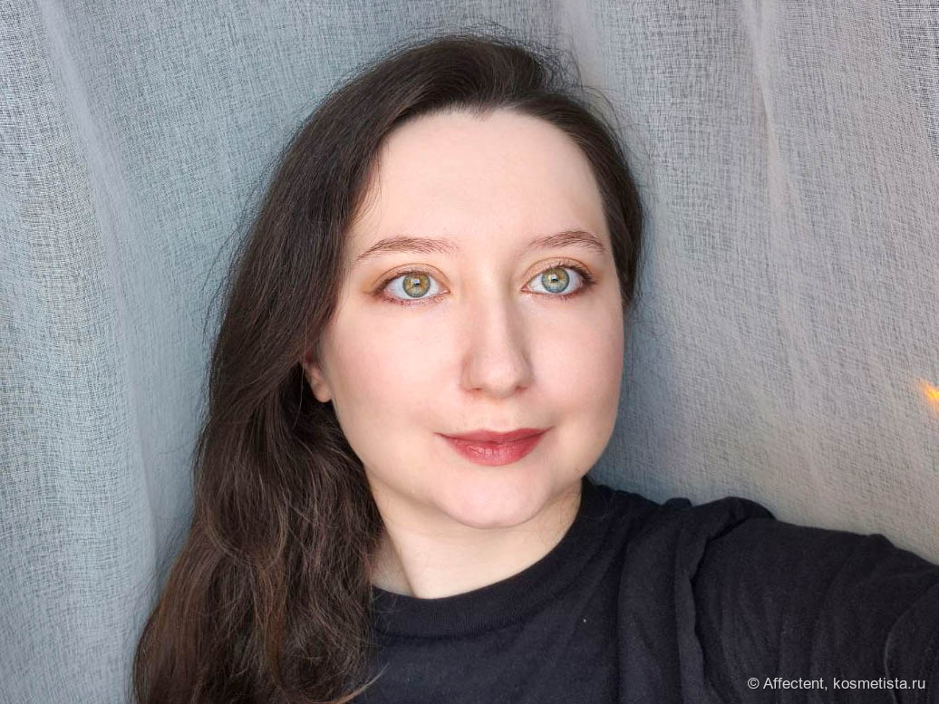 В общем образе даже на корках смотрится нормально. Пыталась вписать его в нейтральный, но ближе к тёплому макияж. Всё-таки рыжеватые оттенки сочетаются с ним не очень хорошо. Однако к откровенно холодным цветам теней он тоже не подойдёт. Тут скорее нужно что-то более-менее нейтральное.
