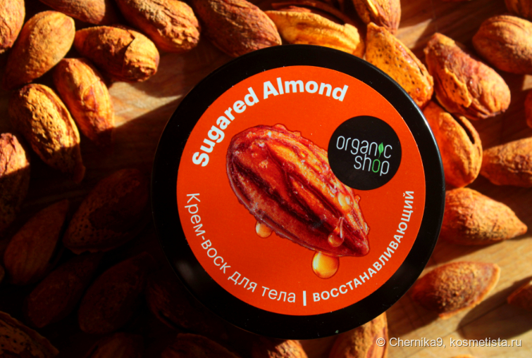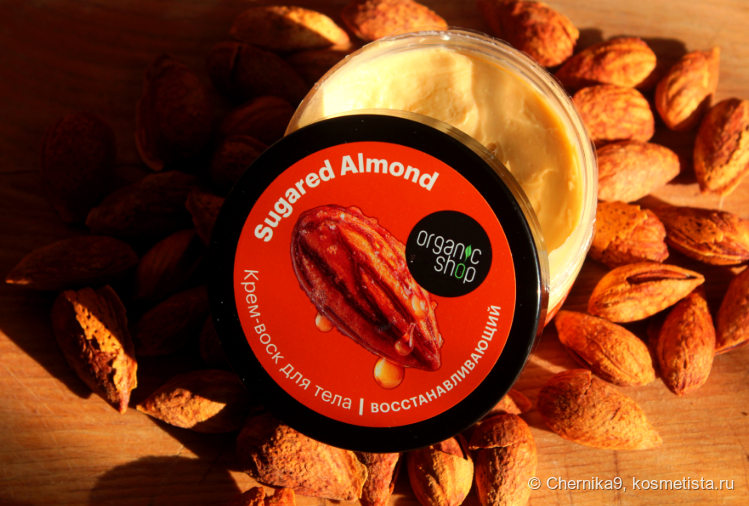 Крема достаточно много в баночке и он очень густой, стоячий, гуще сметаны. По цвету похож на крем-брюле, только намного гуще. Аромат — это что-то нереальное! Мне сразу напомнил миндаль в солёной карамели, который я специально купила к фотографиям, но через него чувствуется аромат парафина, правда, не ярко выраженный. Необычное сочетание церковных свечей с жареным миндалём в солёной карамели! Кстати, руки пахнут долго и очень вкусно, даже духов никаких не надо.