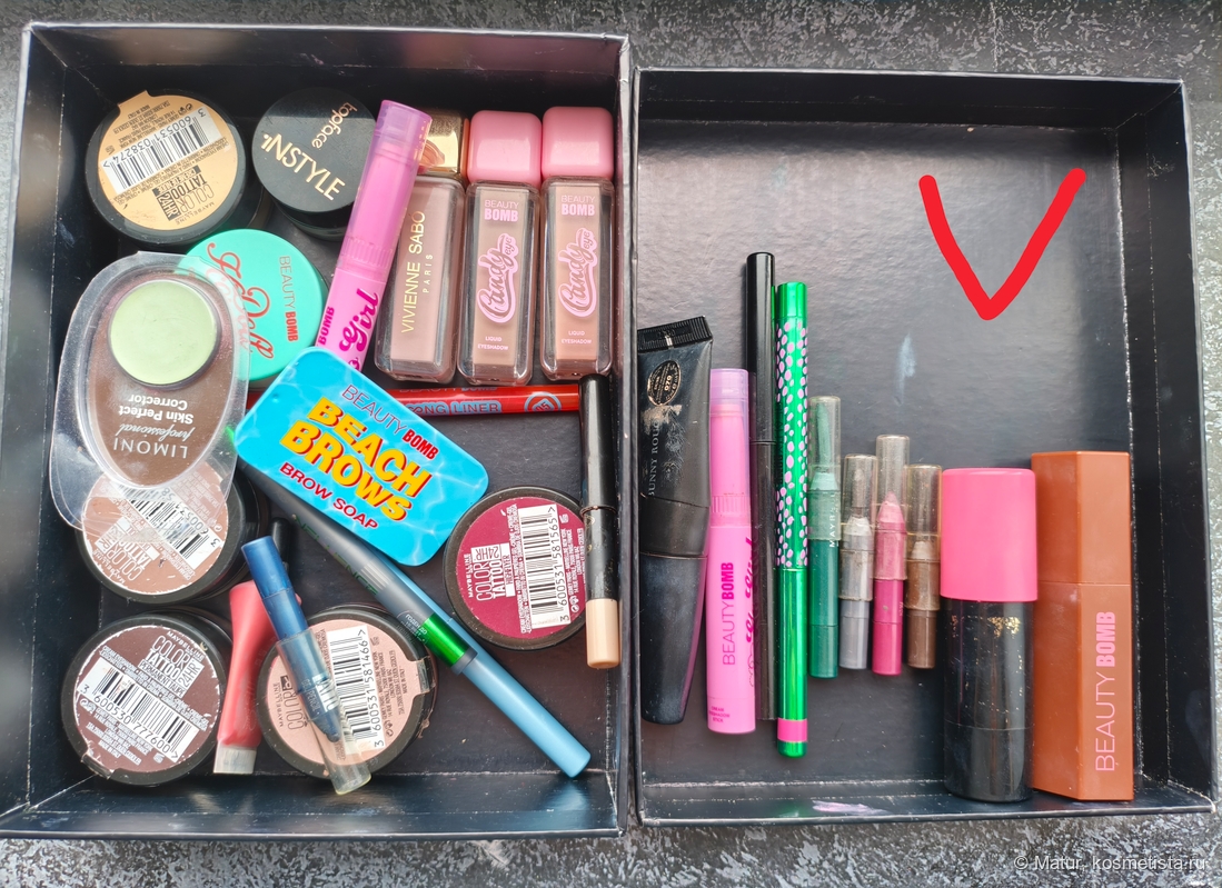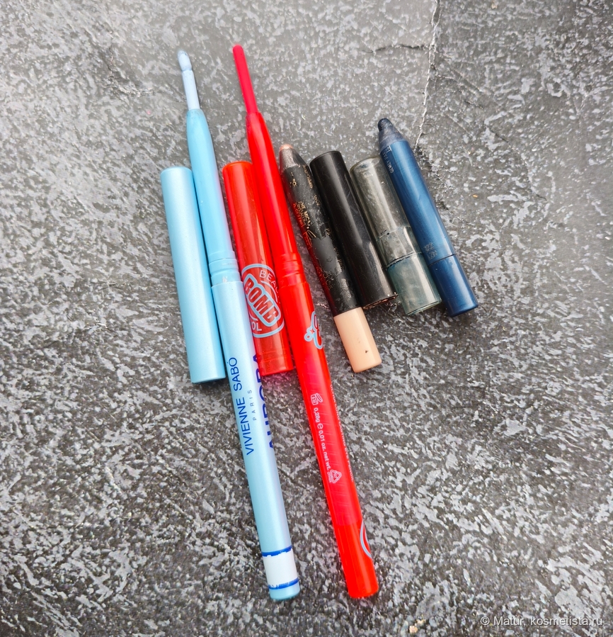Цель была добить все карандаши, наполовину я ее достигла. Остались два Карандаша VS, красный Beauty Bomb и синий Maybelline. Зелёный и бордовый карандаши Maybelline засохли, но там мало оставалось. Красным и голубым карандашами, честно говоря пользовалась мало, свойств своих они не поменяли. А синим и гиммерным карандашами практически каждый день пользуюсь и думаю скоро их добью, там уже совсем чуть-чуть осталось.