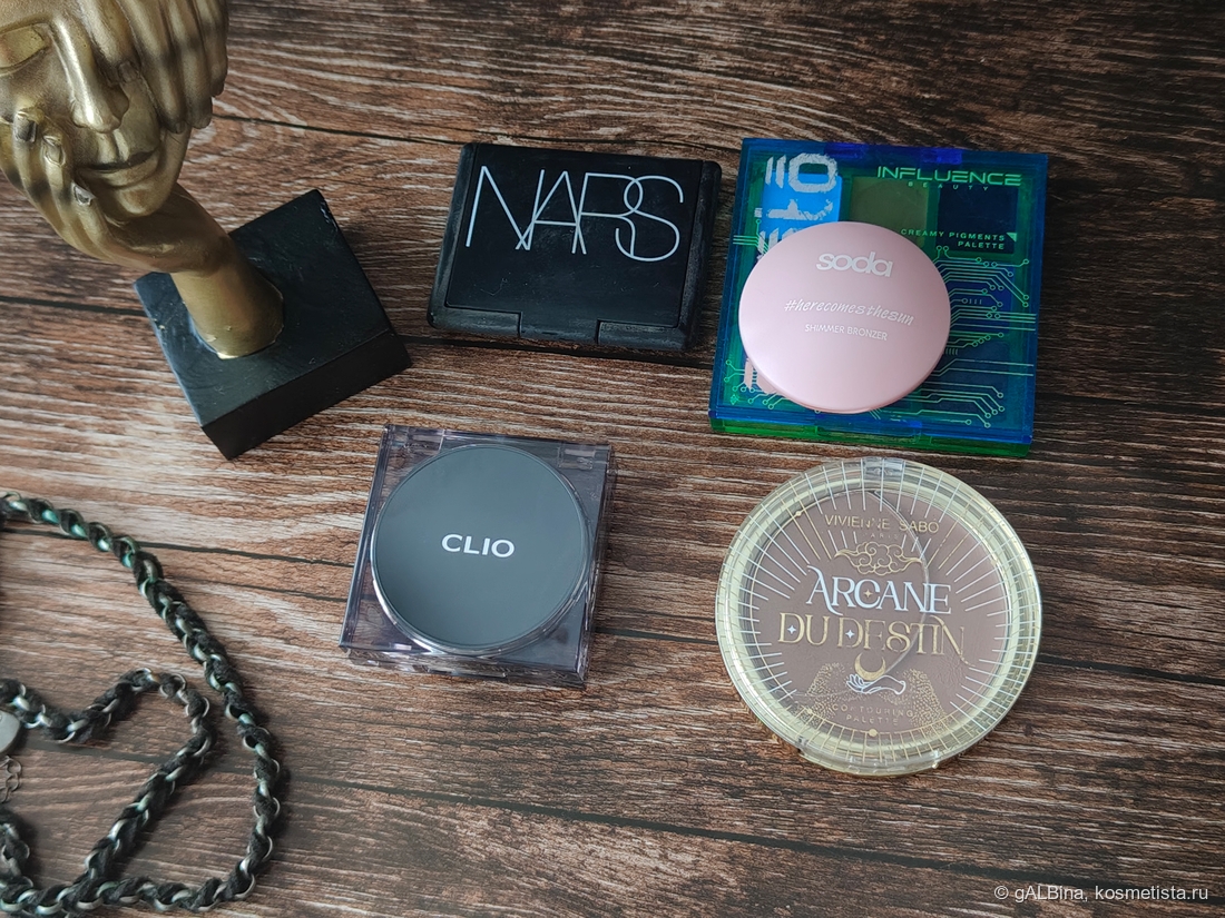 У меня будет несколько вариантов практически одного и того же макияжа с минимальным изменением. Лицо я оформляла всегда одинаково — это обязательно контуринг, румяна, хайлайтер и бронзер, чтобы достаточно чётко читалось и для этого я использовала следующую косметику: