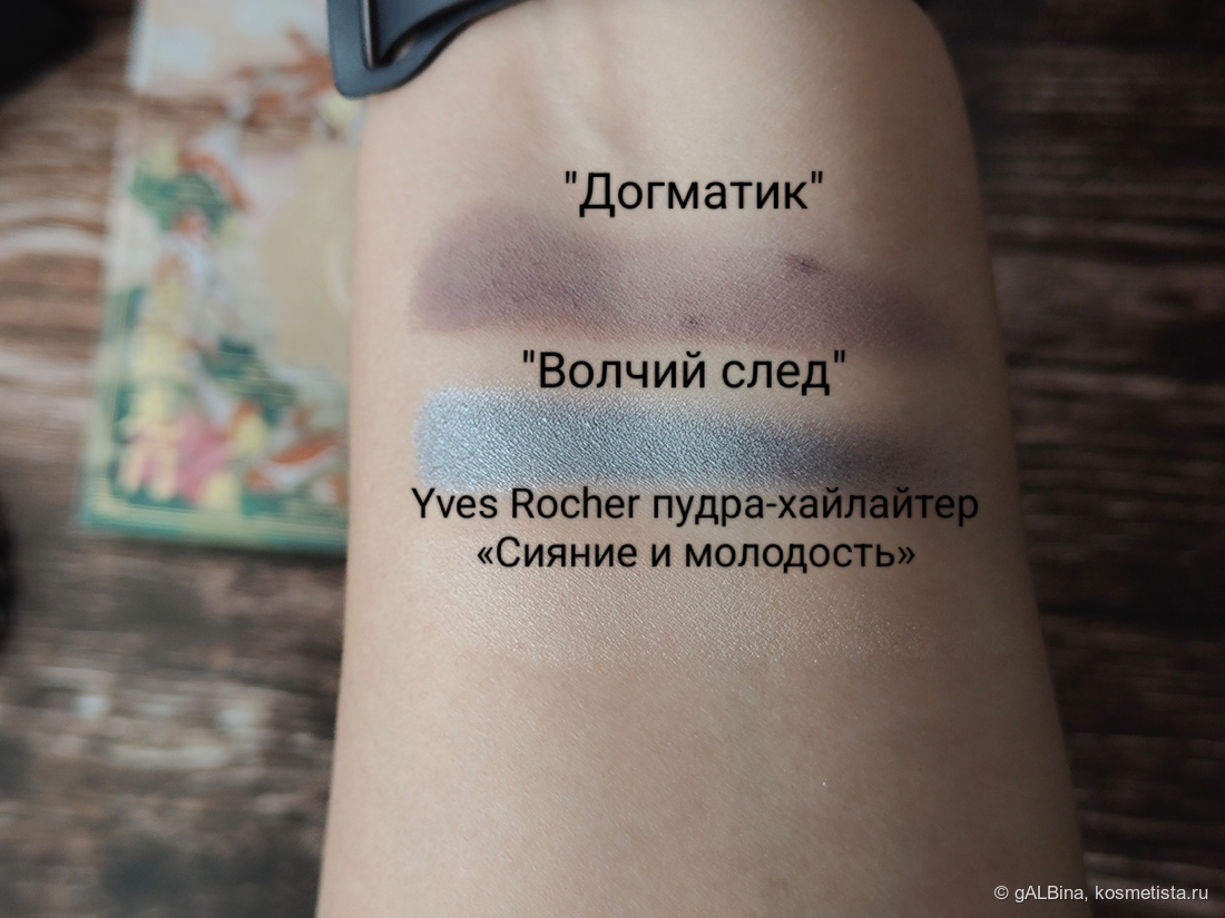 Добавляю сатин и подтушевываю его той же кистью, что наносила матовый оттенок, во внутренний уголок глаза хайлайтер Yves Rocher и прокрашиваю ресницы: