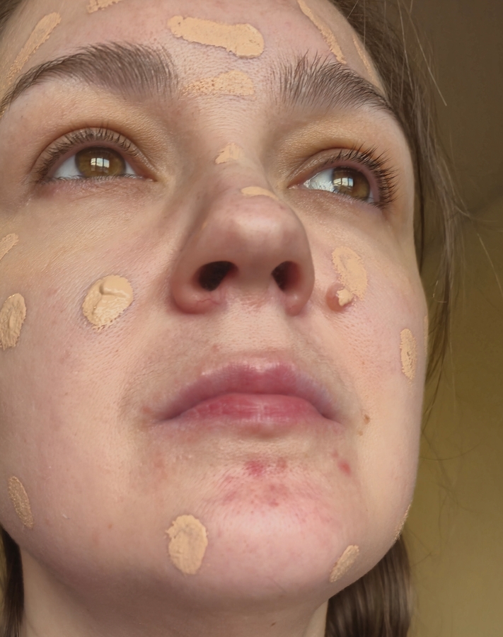 У меня долго этот пост висел в черновиках, как раз удачно высыпало на подбородке, и пусть мои акне очень нефотогеничны, зато наглядно покажу кроющую способность: