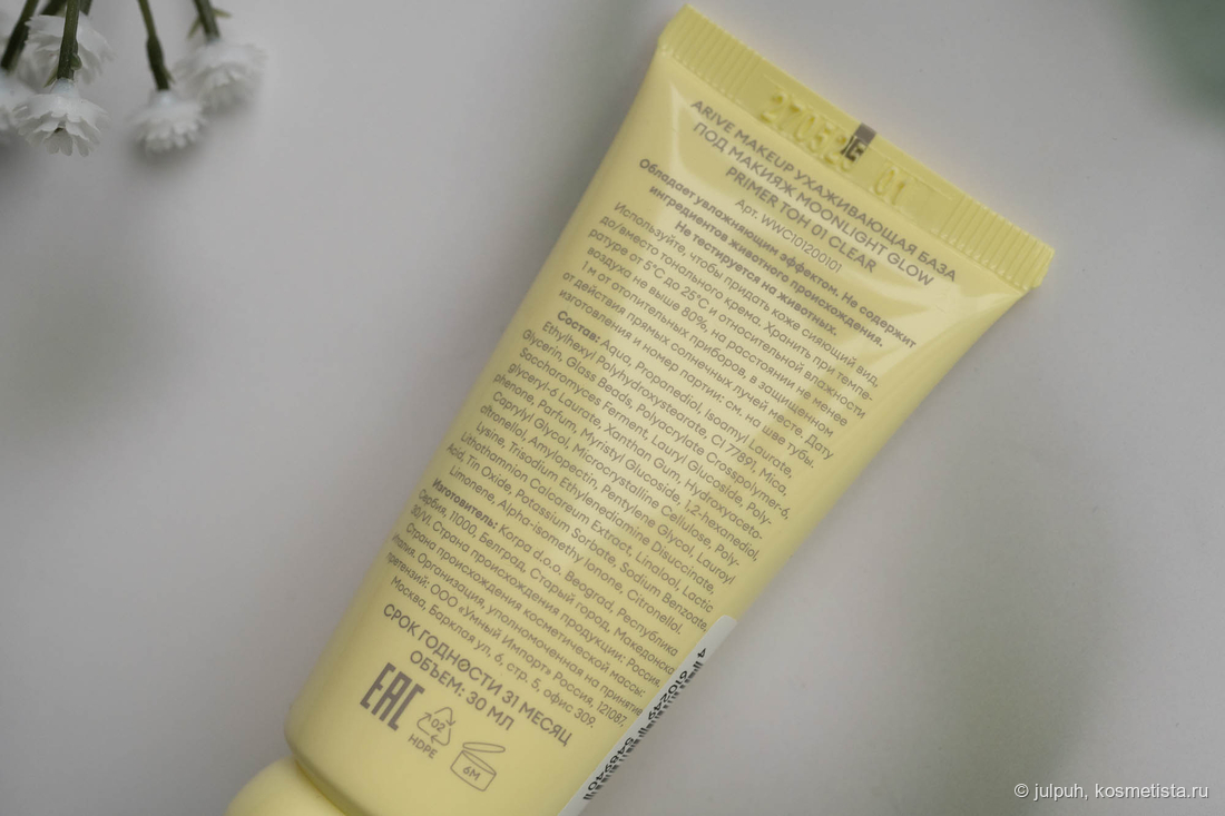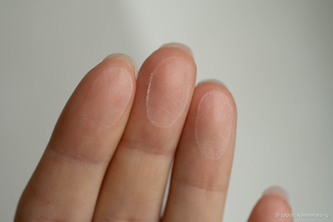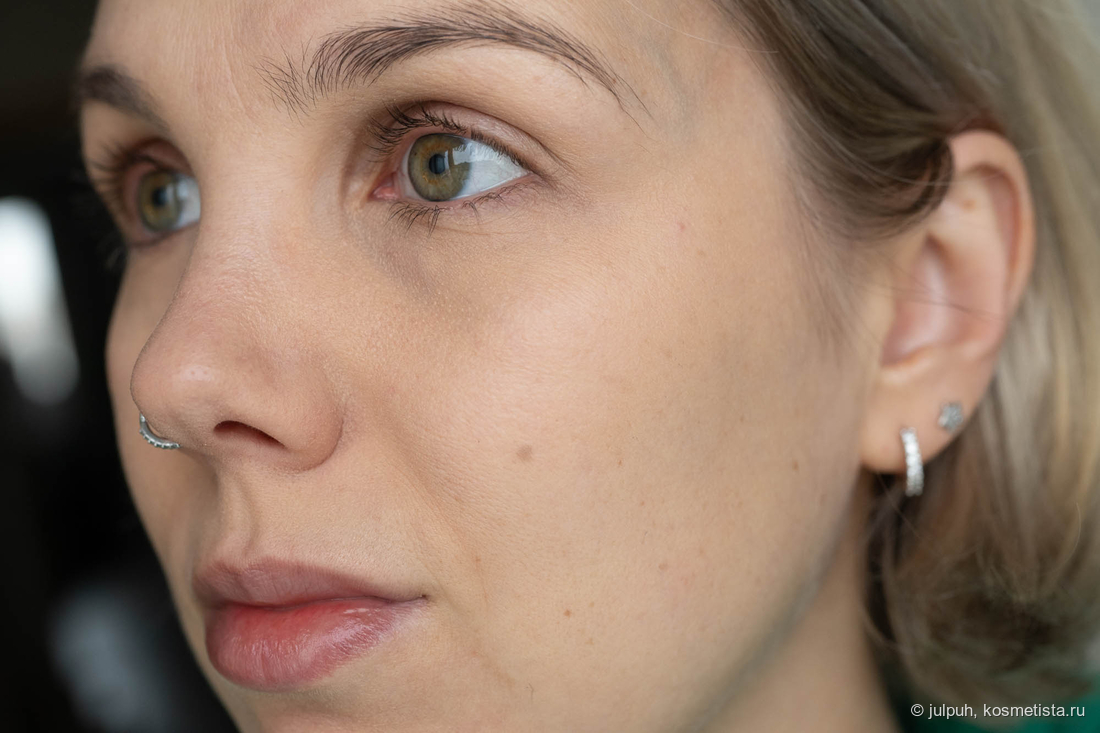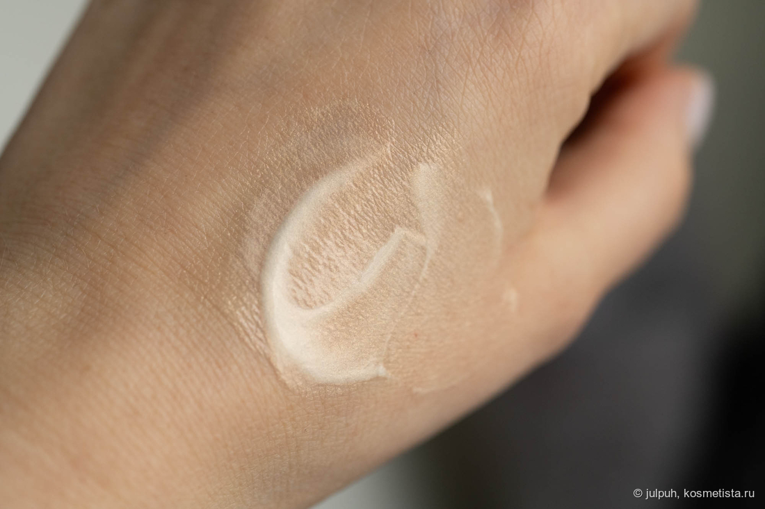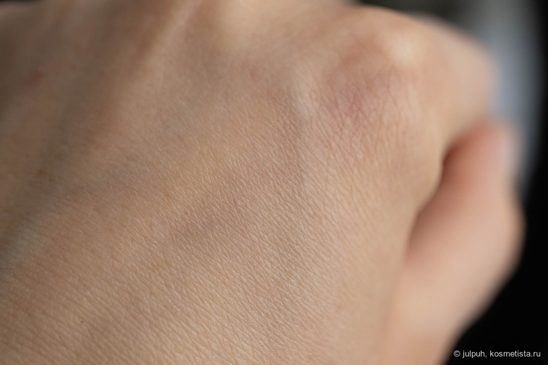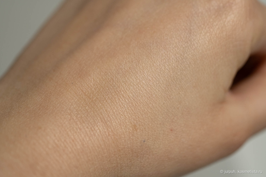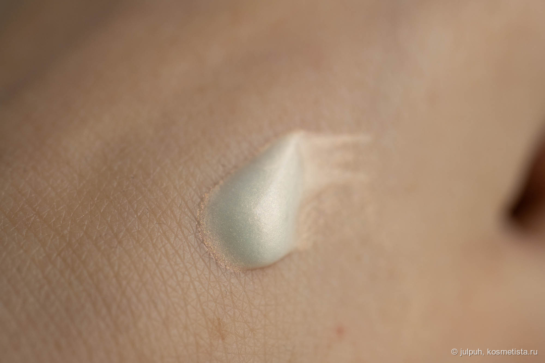 База переливается холтистым и кажется чрезмерно сияющей. При распределении и после впитывания же сияющих частиц не видно, кожа просто равномерно подсвечена, эффект влажности не более.