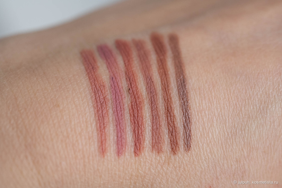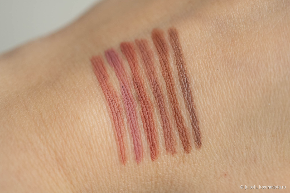 Матовые карандашики для губ в нюдовых оттенках. Упаковка приятного цвета пыльной розы, сами оттенки карандашей помечены на кончиках.