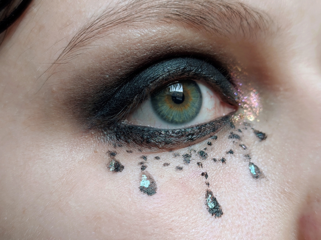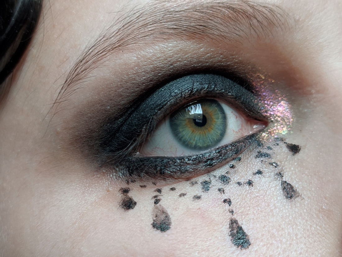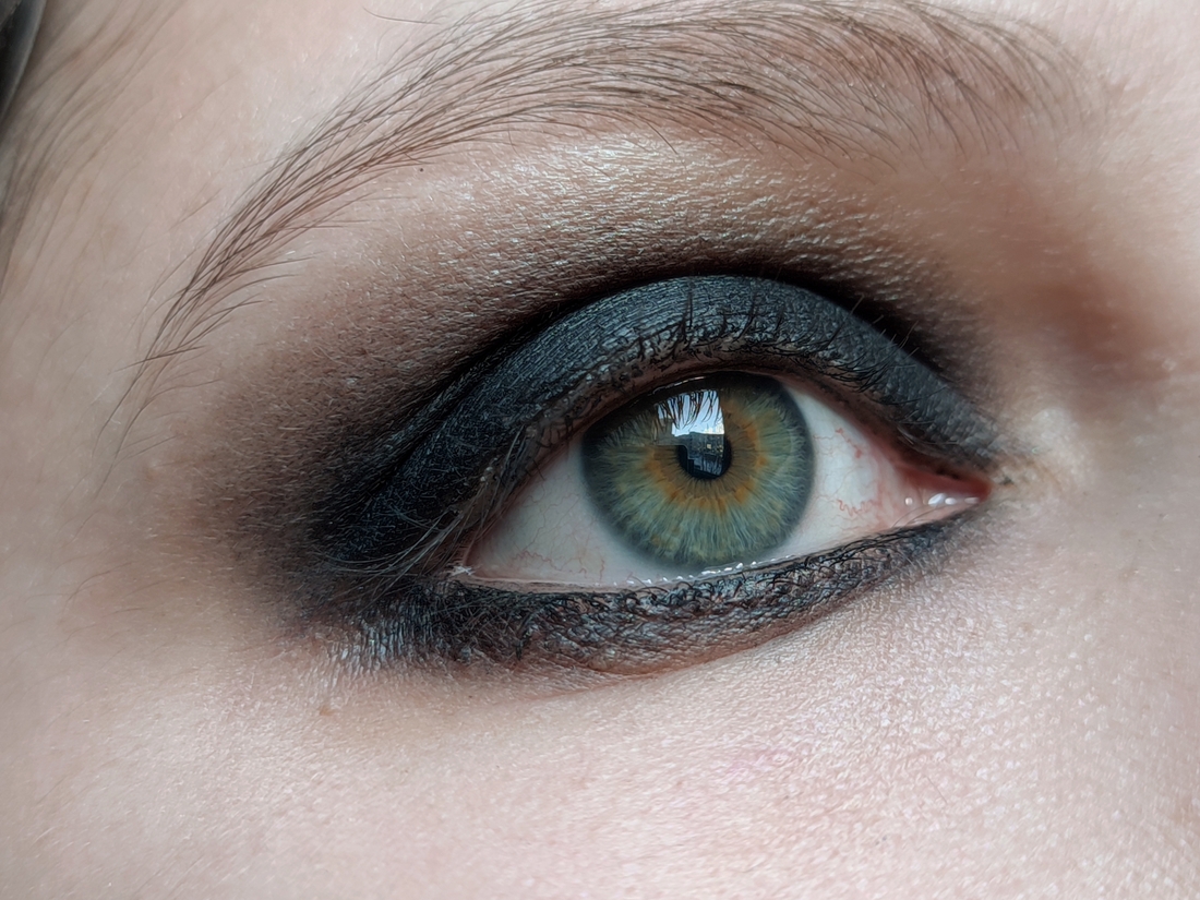 Но у нас неоготический макияж, поэтому поностольгировала над своим маленьким глазом и продолжаю возюкать по веку карандашом. Делаю карандашную подложку под тени там, где мне бы хотелось видеть пигмент плотнее.