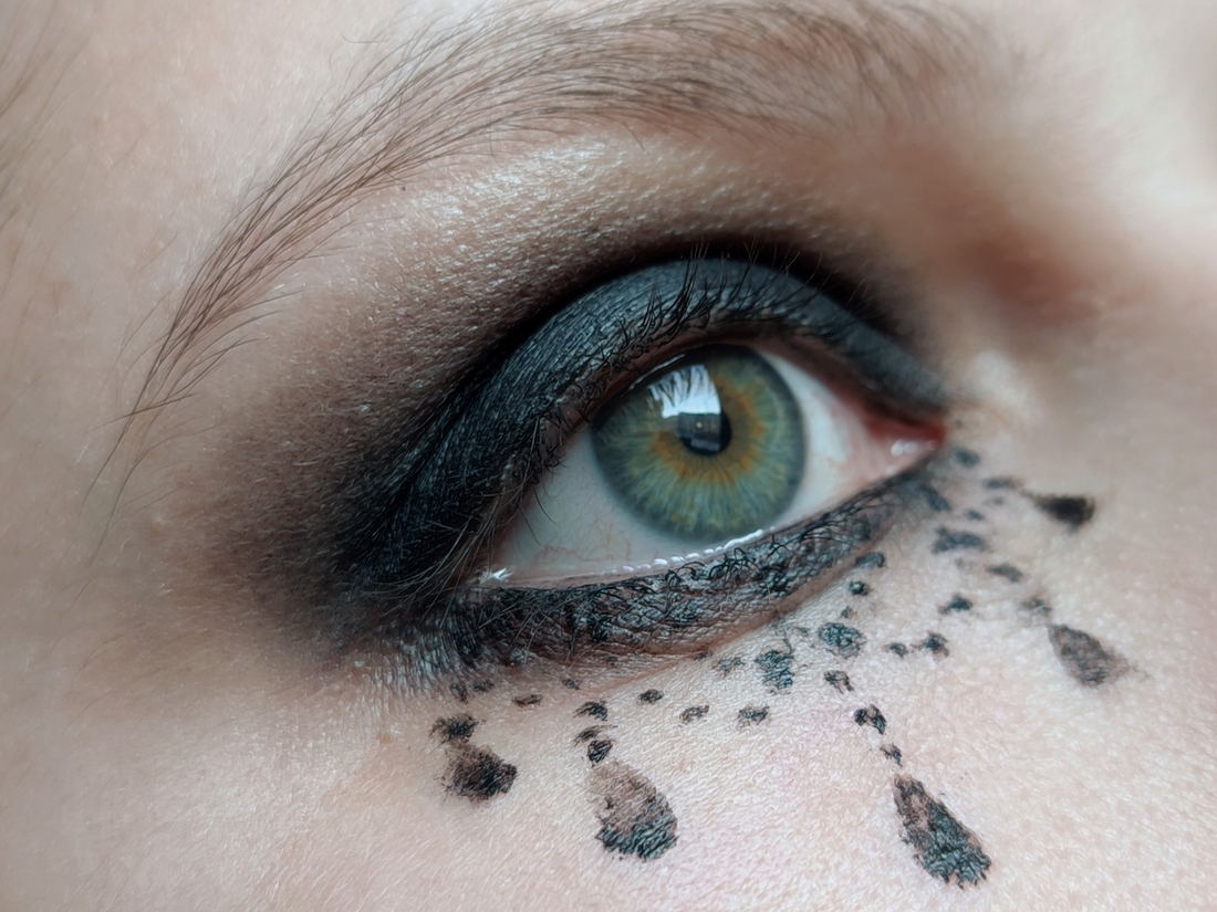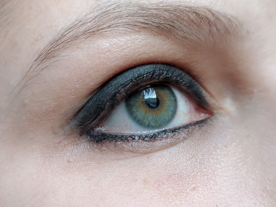 Беру черный карандаш Pupa, вспоминаю молодость и заполняю им нижнюю слизистую, межресничку и линию вдоль ресниц. Так выглядел трушный готический макияж, только ресницы осталось прокрасить.