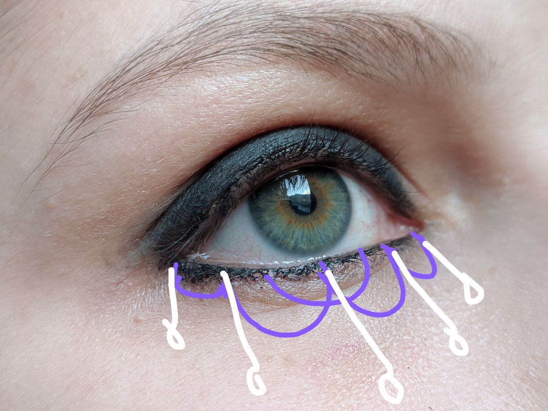 Теперь надо сделать свисающие хрусталики. Прикладывая наконечник линера плашмя, делаю пять капель и соединяю их точками с нижним ресничным краем. Схема такая: