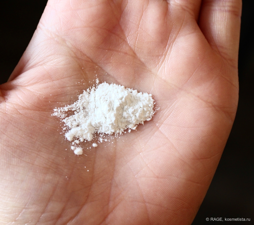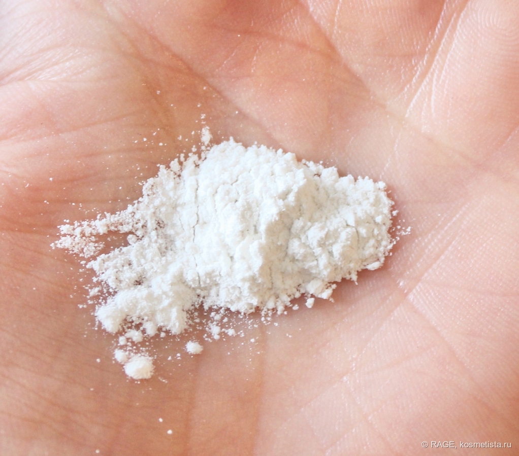 Текстура порошкообразная, с очень мелким помолом (пудра есть пудра), цвет белый: