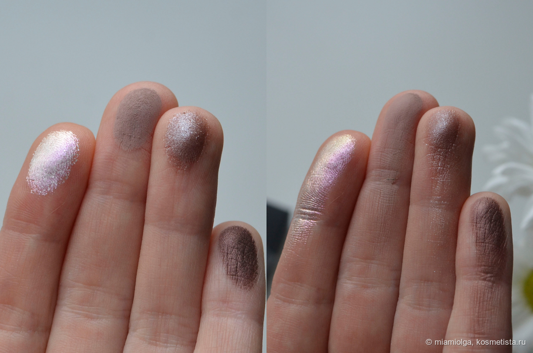 У теней отличная пигментация. С ними приятно работать, тушуются быстро, на веко переносятся без усилий. Шиммеры наношу пальцами прибивающими движениями, от кисти они могут осыпаться на нижнее веко.