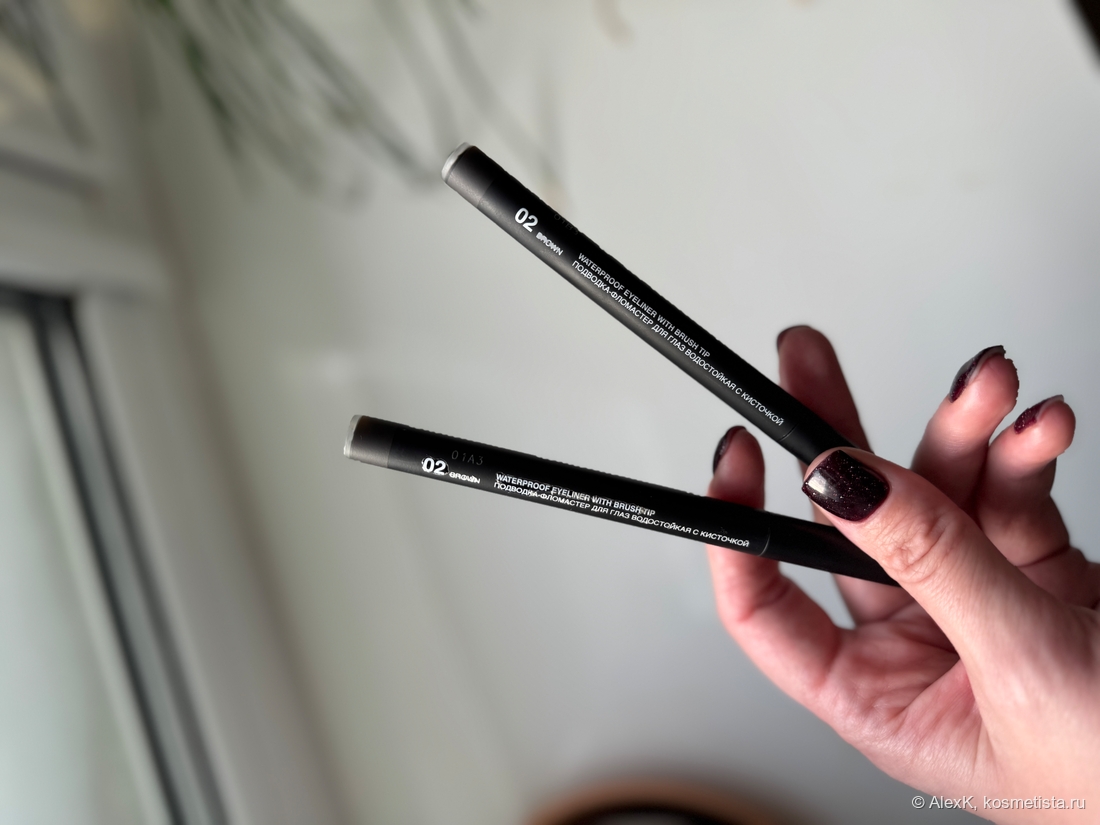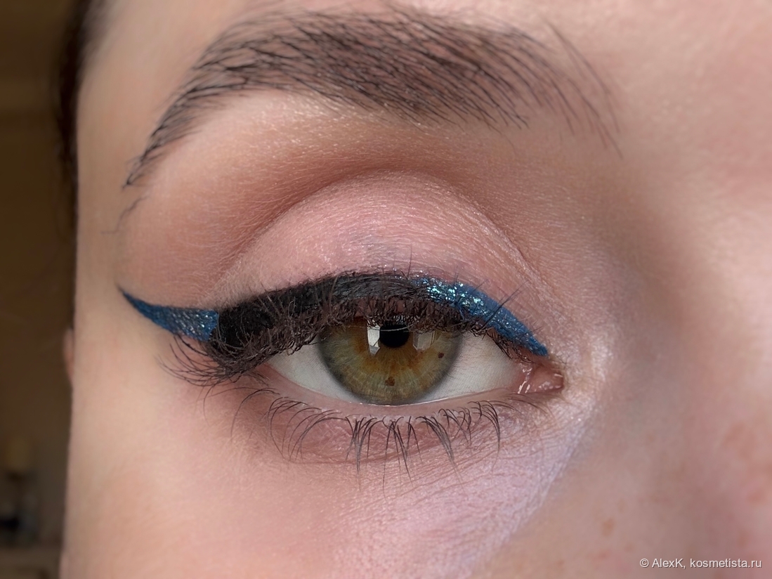 Изначально планировала использовать для контура черную виниловую подводку от Luxvisage. Но кто-то из дочек приделал ей ноги (это нормальное явление в доме с двумя подростками). Пришлось снизойти до темно-коричневого лайнера с кисточкой от Relouis. И, вы не поверите, в это же мгновение он решил закончиться. Ааааа! Благо, в запасах был совсем новый флакон на замену. Но отгадайте что? Вместо темно-коричневого он выдал мне цвет детской неожиданности. Пришлось выкручиваться.