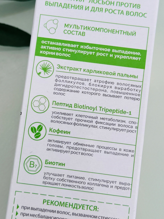 Пептид Biotinoyl Tripeptide-1 усиливает клеточный метаболизм, способствует прочной фиксации волоса в волосяных фолликулах, стимулирует рост.