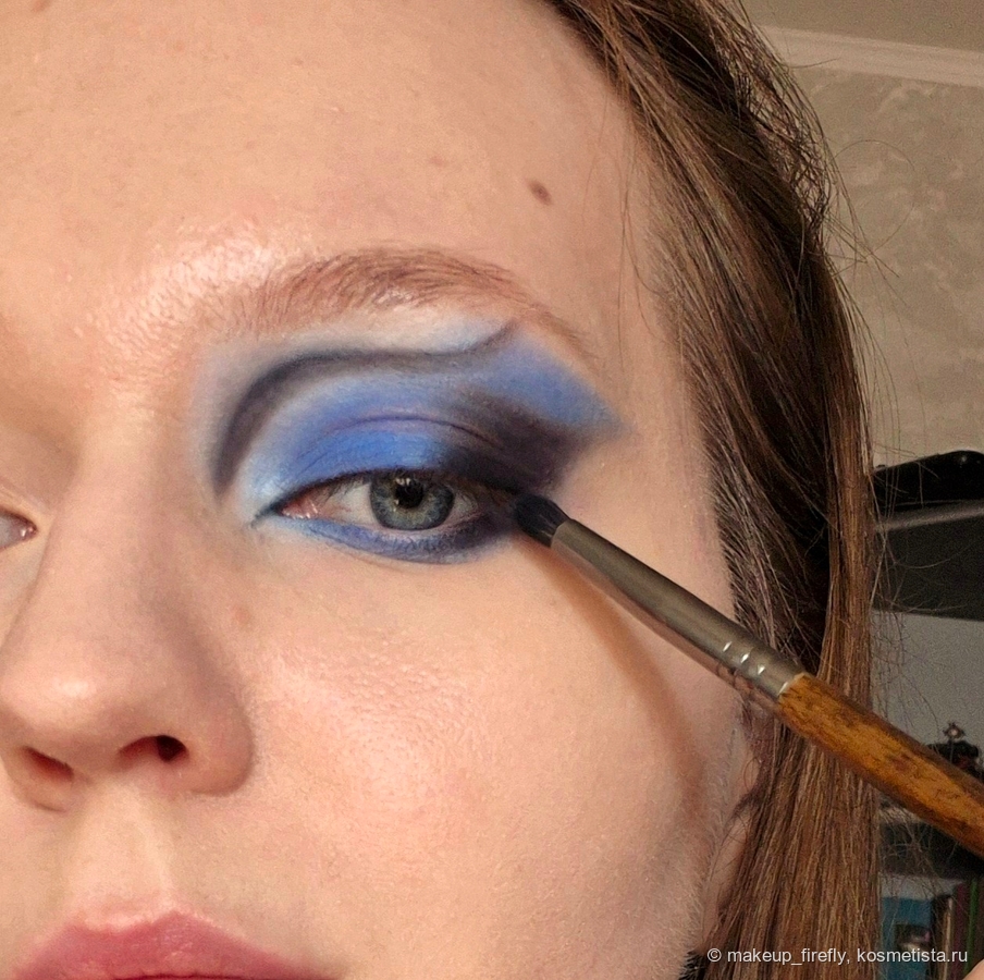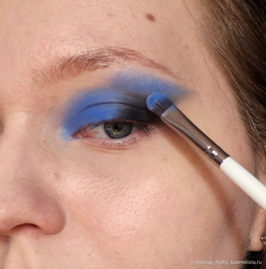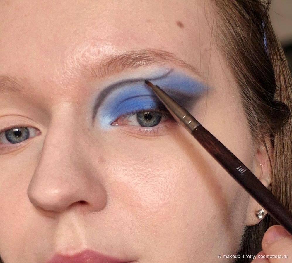 Вторым этапом наношу кремовый синий оттенок плоской кистью, немного оттягиваю, но в целом можно остановиться и на середине.