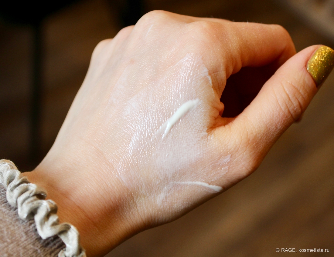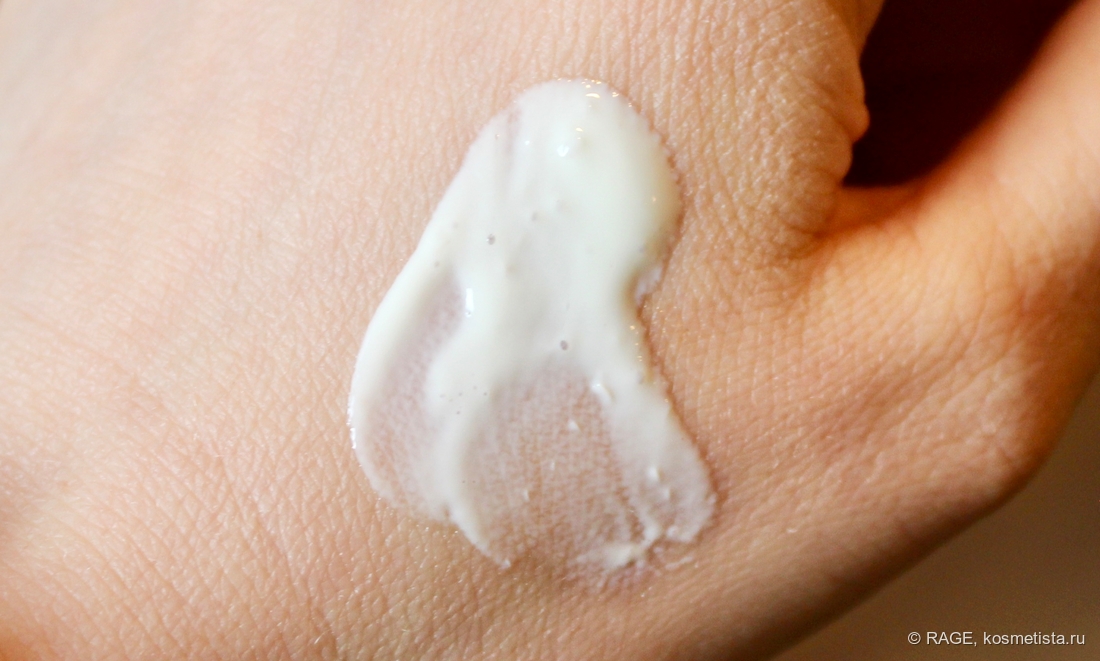 Текстура ближе к кремовой (т.е. не совсем флюидная), цвет белый, запах отсутствует.