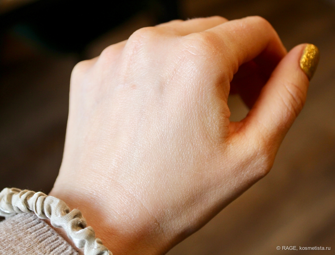 Наносится флюид равномерно, не скатывается и не проваливается в поры и морщинки, не оставляет разводов и не выбеливает кожу.