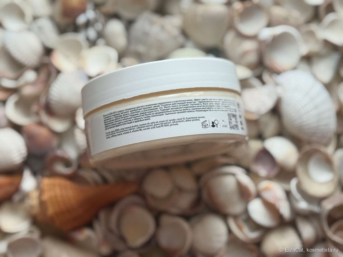 Дизайн минималистичный, баночка удобная. Проблем с закрытием крышки нет, всё герметично. Текстура очень плотная, но при этом хорошо распределяется по волосам. Аромат приятный.