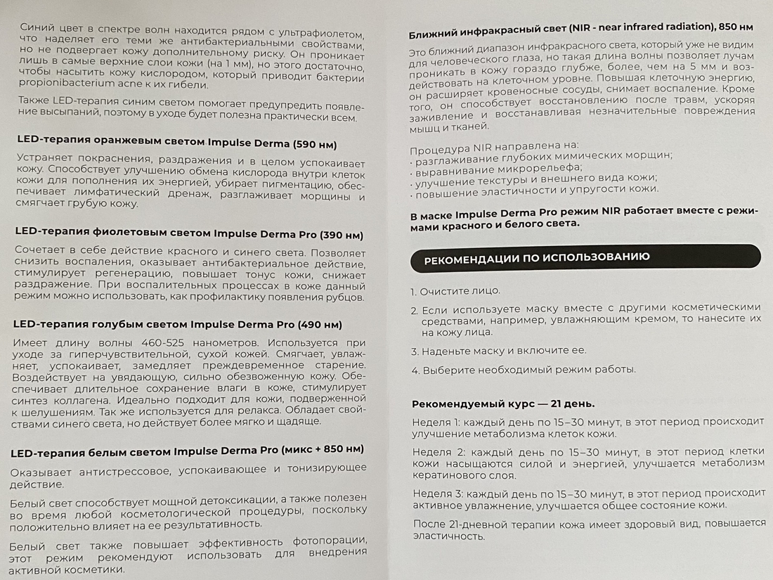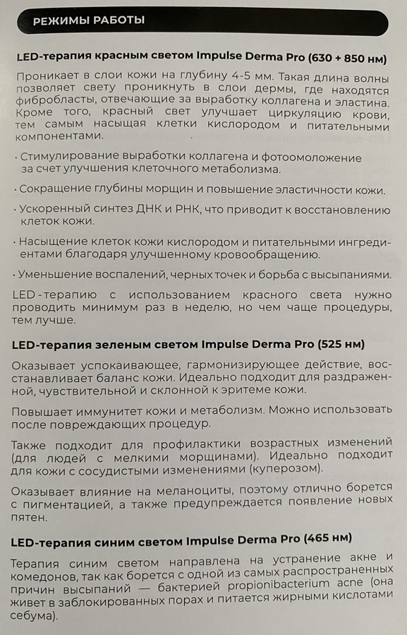 LED-маска IMPULSE DERMA PRO — реально рабочий инструмент, а не просто светящиеся огоньки. Какой-то спектор дает достаточно быстрый заметный эффект (как синий), что-то требует регулярное курсовое использование (как красный или оранжевый) и эффект не мгновенный, но накопительный и заметный.