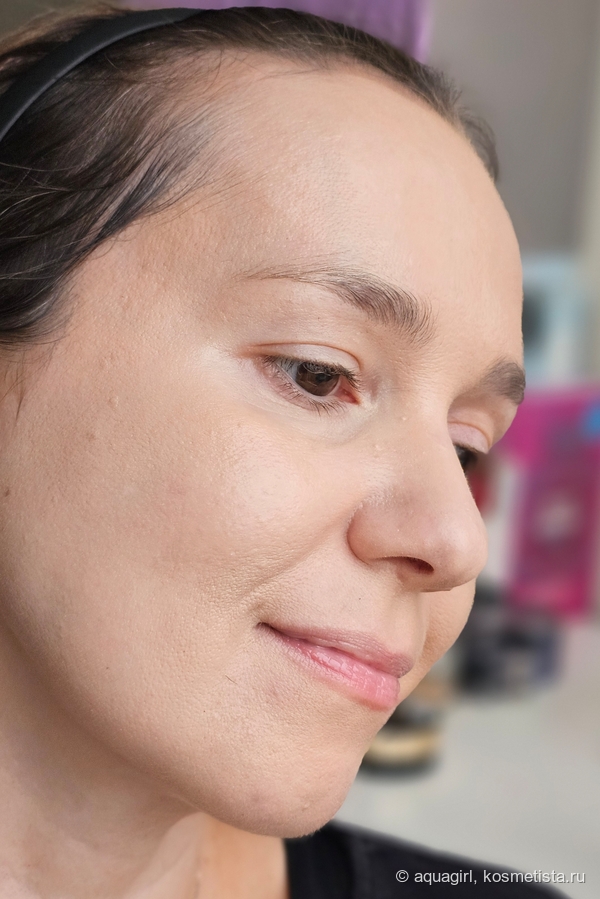 Здесь я уже набирала тон по чуть-чуть и распределяла его поглаживающимися движениями от центра к периферии. Оказалось, что он прекрасно растягивается, покрытие получается тонким, но при этом достаточно кроющим.