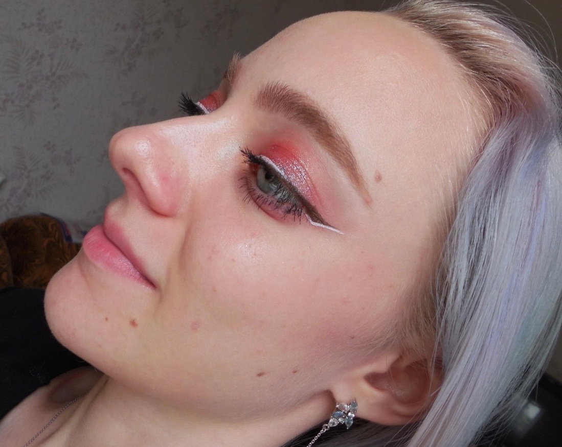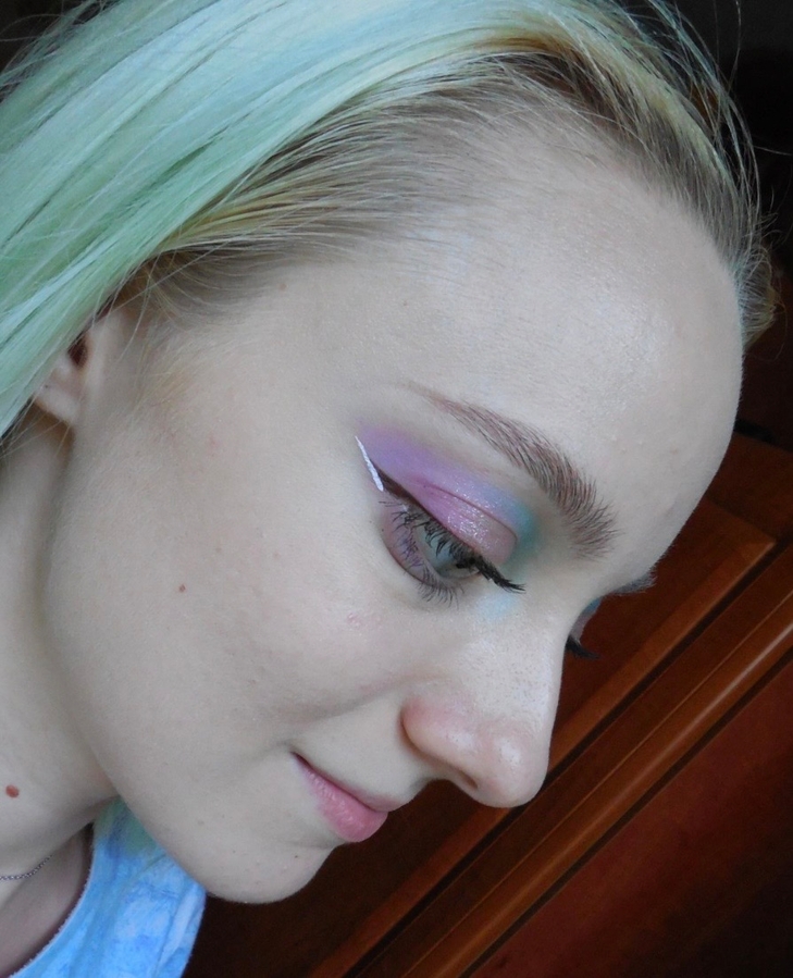 Рисовала, на минуточку, прямо поверх тёмно-зелёной подводки. Кое-где цвета немного смешались, но всё равно посмотрите как белый полностью перекрыл тёмный цвет подводки, вот этого я никак не ожидала.