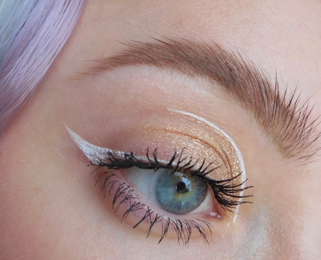 Макияж №5. Ещё один из моих самых любимых вариантов. Хотя первый раз идея родилась на ходу просто. От внутреннего уголка и примерно до середины подвижного века нанесла жидкую подводку в золотистом оттенке, но это могут быть любые тени. Причём от внутреннего уголка наносила поплотнее, а к серединке сводила на нет, чтобы блёсточки буквально уходили в никуда. Добавила белую стрелочку этой подводкой и небольшой акцент чтобы очертить границу нанесения сияющей подводки. Как же мне было красиво, я весь день любовалась.