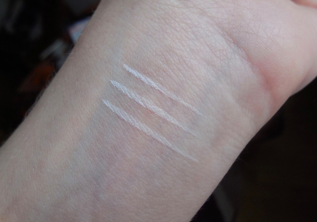 Оттенок здесь не самый насыщенный и не снежно-белый, но при этом он достаточно плотный, как для белого цвета, я ожидала гораздо худшего. Ложится шикарно, не полосит, наслаивать не надо… Я просто не могла поверить своим глазам. Хотя по руке и кажется, что свотч немного расползся. Может, не до конца вытерла руку после предыдущих свотчей. Однако дальше вы увидите, что на глазах такого нет.