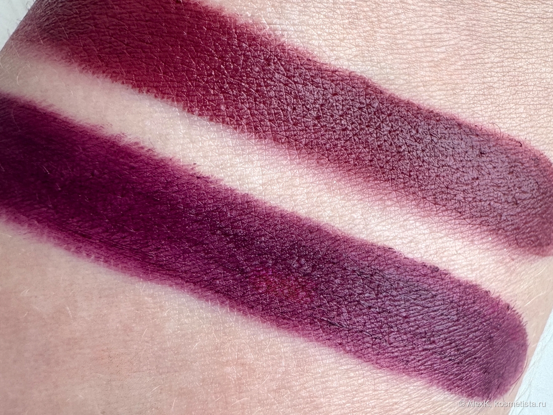 А это сравнение двух оттенков: 19 бордо и 20 темно-сливовый. Тут, кстати, видно, как герой поста пятнит и залипает (внизу). Интересно, что сливовый на самом деле не темнее бордового. Он просто холоднее. а еще при одинаковом составе у них отлисаются текстуры. Сливовый 20 — тугой, пятнит, пигментированный и стойкий. Бордовый 19 — тоже пигментированный, но более мягкий, послушный, комфортный и ожидаемо менее стойкий.