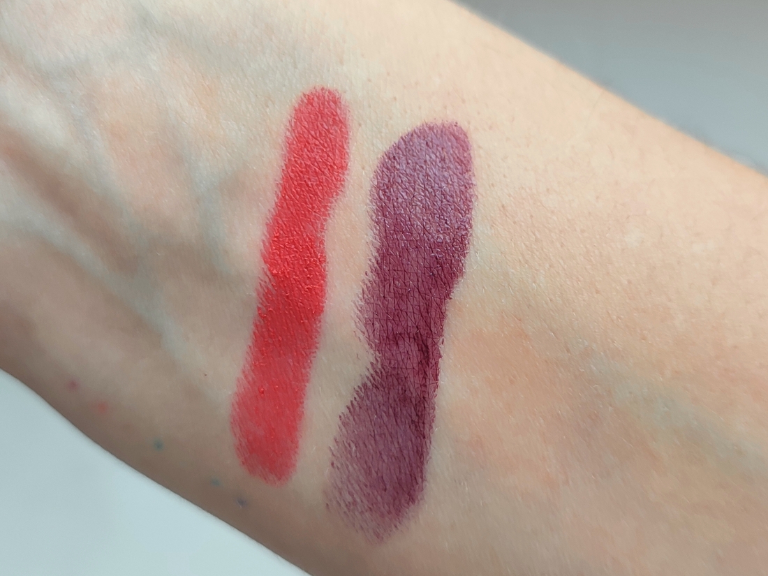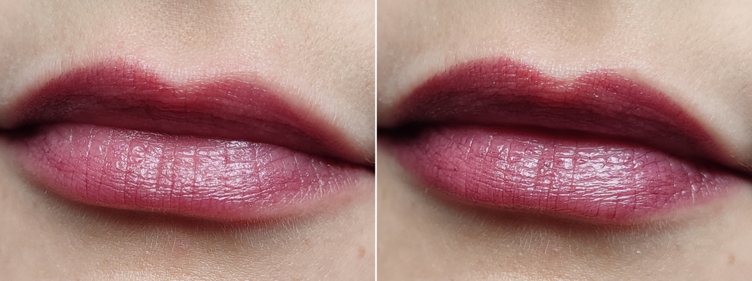 Помада тонким слоем слева и помада в один слой с небольшим нажимом на стик справа: