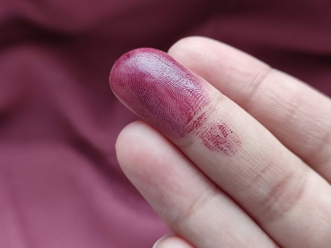 Финиш глянцевый и влажный. Не фиксируется и отпечатывается на всех поверхностях. Как и любая кремовая помада.