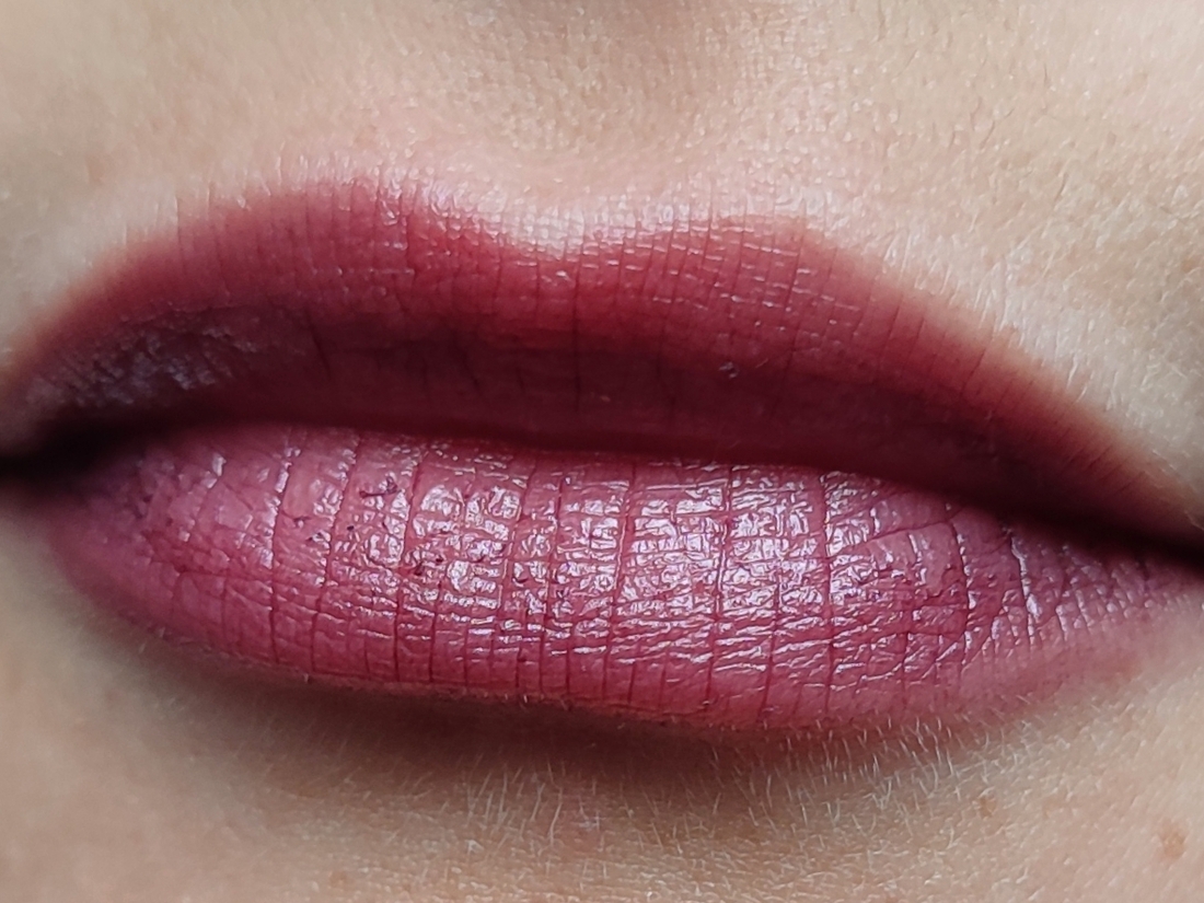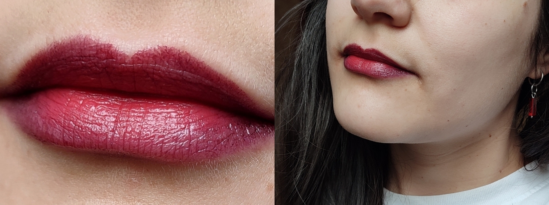 Нанесение. Так как оттенок темный, он подчеркивает все шелушения и недостатки. И если приглядываться, можно заметить, что пигмент проваливается в складочки. Как я понимаю, это свойственно темным помадам, и я в этом не вижу недостатка. Тем более, что при живом общении этого совершенно не видно. В других оттенках скорее всего такого эффекта вообще не будет.